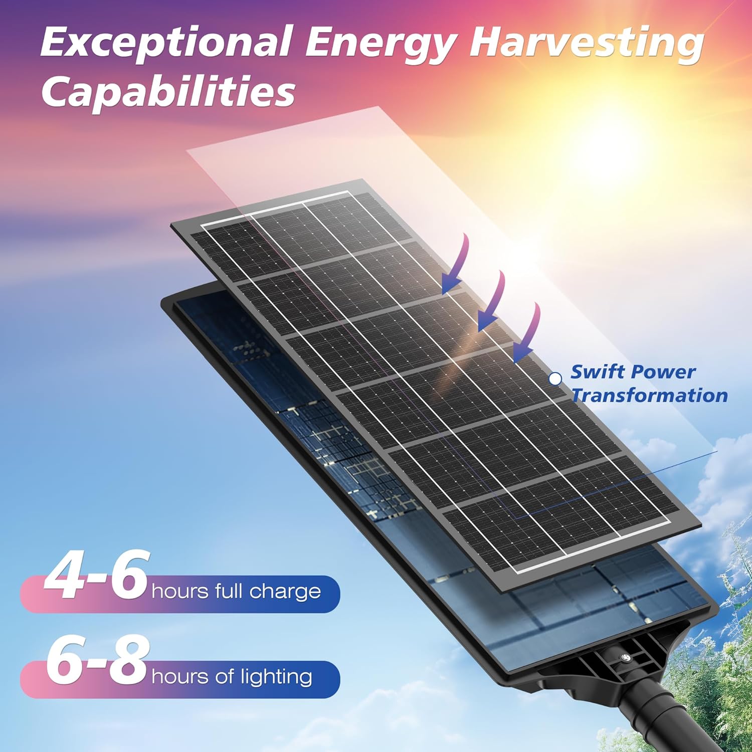[ Efficient Solar Powered Illumination ] Powered by a 6V/5W polycrystalline solar panel, these solar flood lights outdoor boast an impressive 25% solar energy conversion rate. With a 5000mAH battery fully charging in 4-6 hours, these solar street light provide continuous lighting for 6-8 hours.