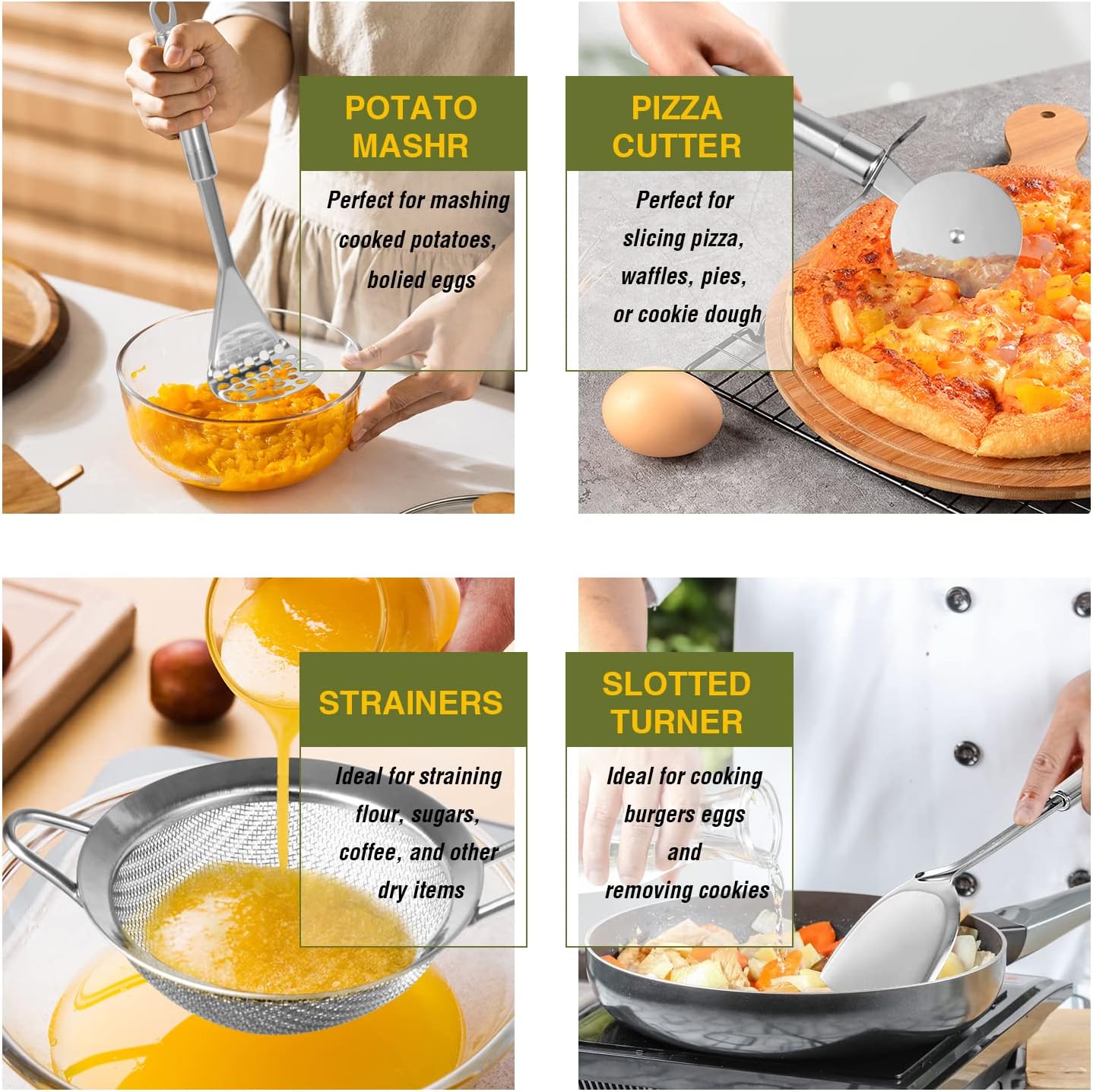 Durable Long Lasting Kitchen Utensil Set: Our utensils with comfortable grip designed to be durable making sure the utensils will last you for years to come. This stainless steel high-quality kitchenware allows you to need not to replace your spatula or ladle in 5 months but can enjoy your kitchen tools for years to come. Say goodbye to inferior kitchenware, no need to replace cheap kitchenware all the time