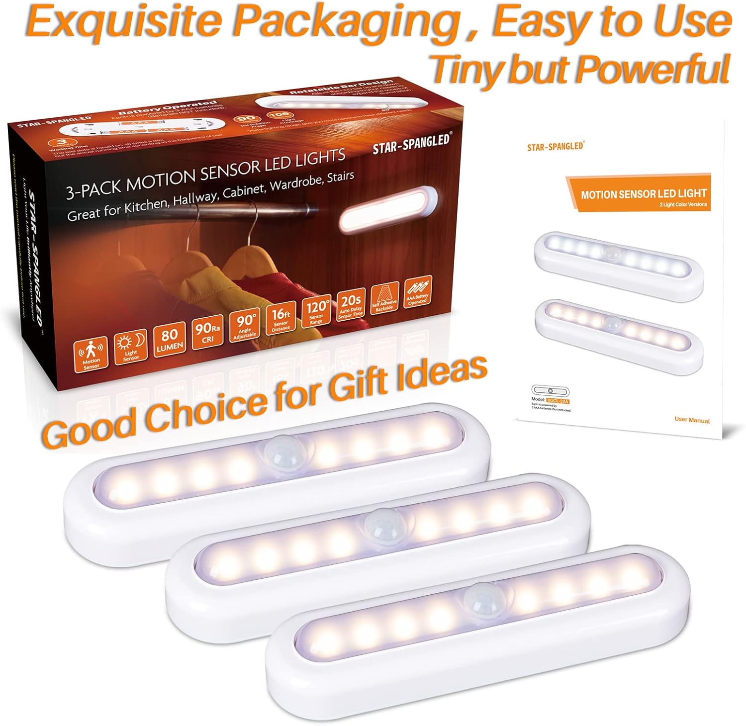 STAR-SPANGLED 7inch Motion Sensor Light Indoor, Stick on Lights Battery Powered, Closet Lights Motion Activated Operated, LED Night Stair Lights for Under Cabinet, Hallway, Kitchen (Warm White, 3 Pack)