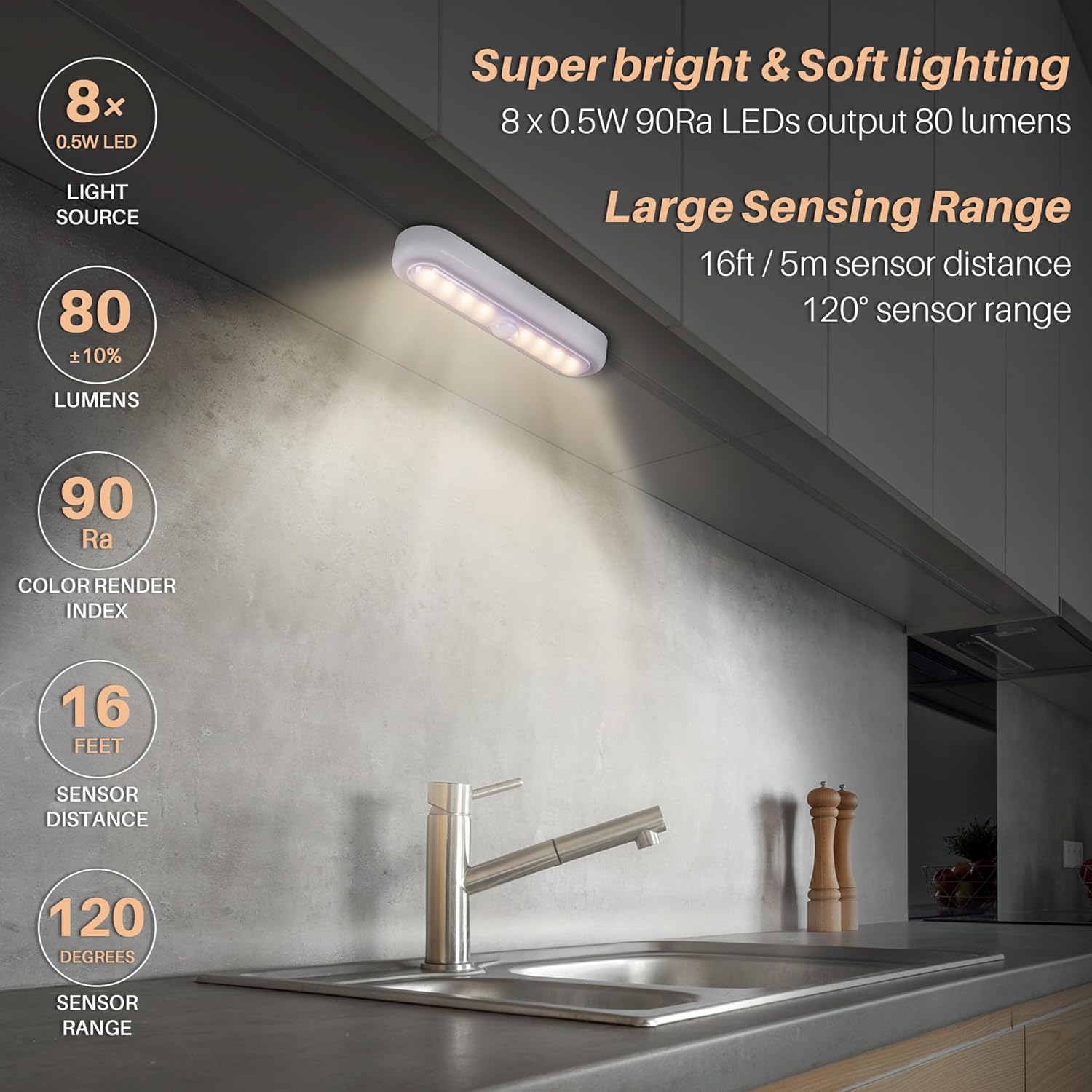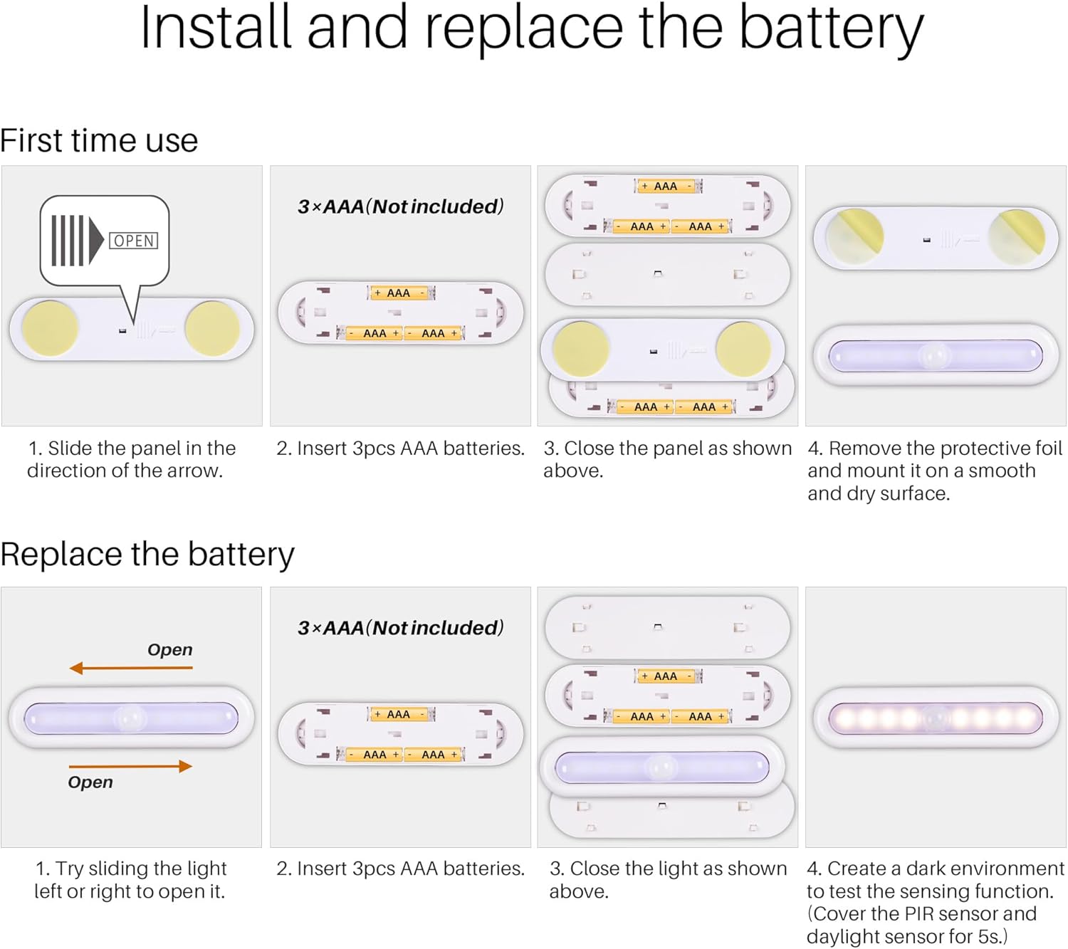 Rich sensing configuration: Motion Sensor (Infrared Sensor), Light Sensor and Auto-delay function.”A+” Sensor: 0 sec activated, 16ft (5m) sensor distance, 120° sensor range.”A+” Light source: 8×0.5W 140 Lm/W Ra90 LEDs output 80 lumens with high CRI.90° Swivel light bar: Adjust the LED bar up and down according to your needs to expand the scope of illumination and detection.AAA Battery powered: Each uses 3 AAA batteries (not included) , no wiring needed.High light transmittance lens: 70% light transmittance anti-glare lens, ensuring eye-protecting while improving light efficiency.Easy installation: Custom “A+” super-sticky adhesive that lasts and won’t fall off. Perfect for closet, cabinet, counter, stairs, kitchen, storage room.