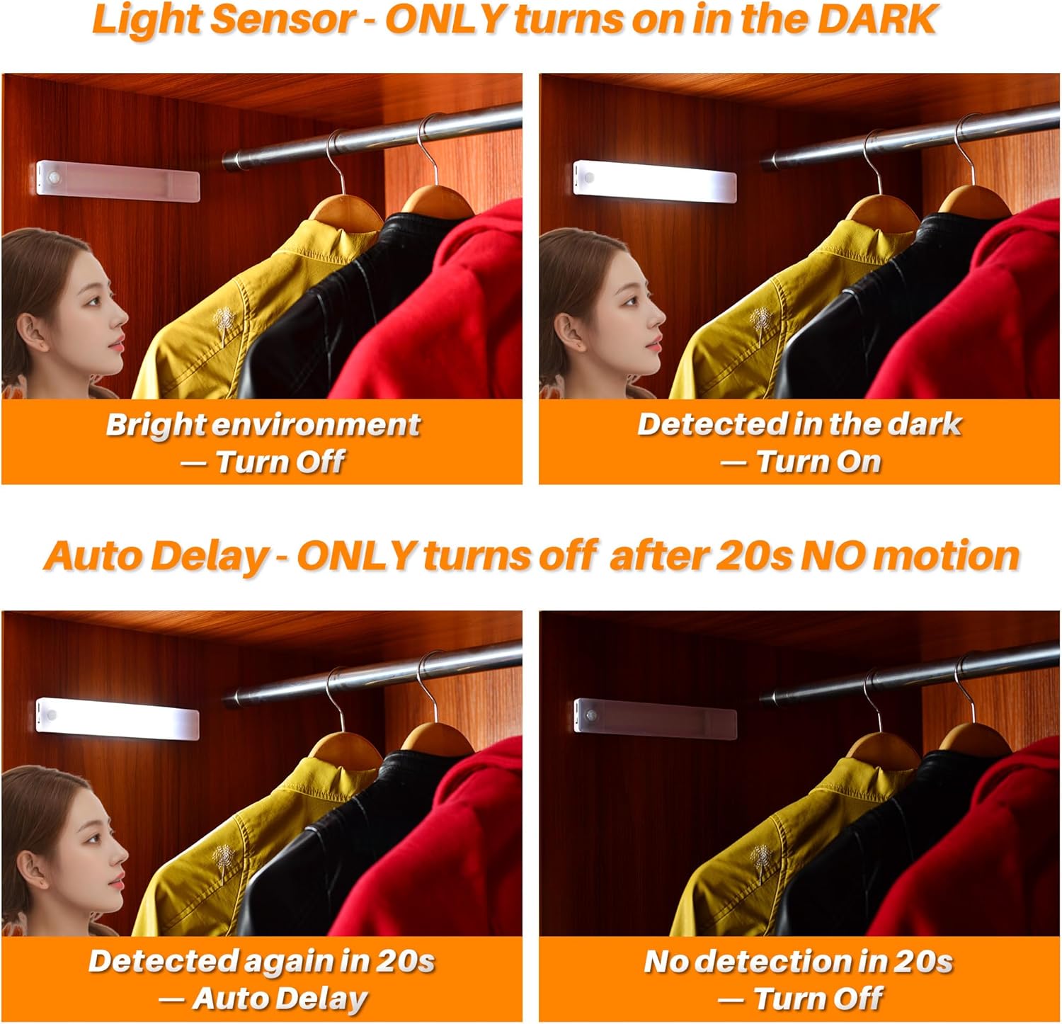 Our motion sensor closet lights have motion sensor, light sensor and automatic delay function. It will not light up in bright environment to save energy.