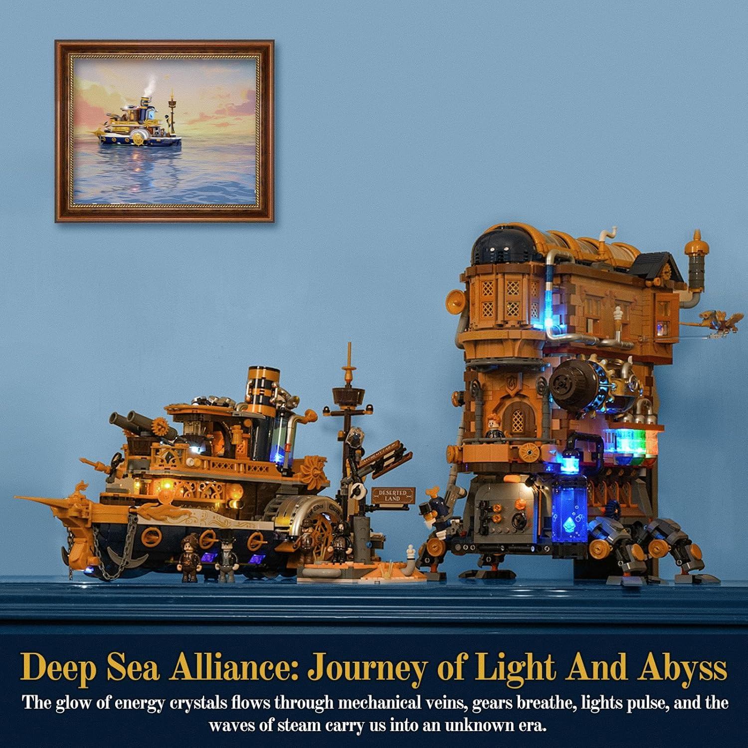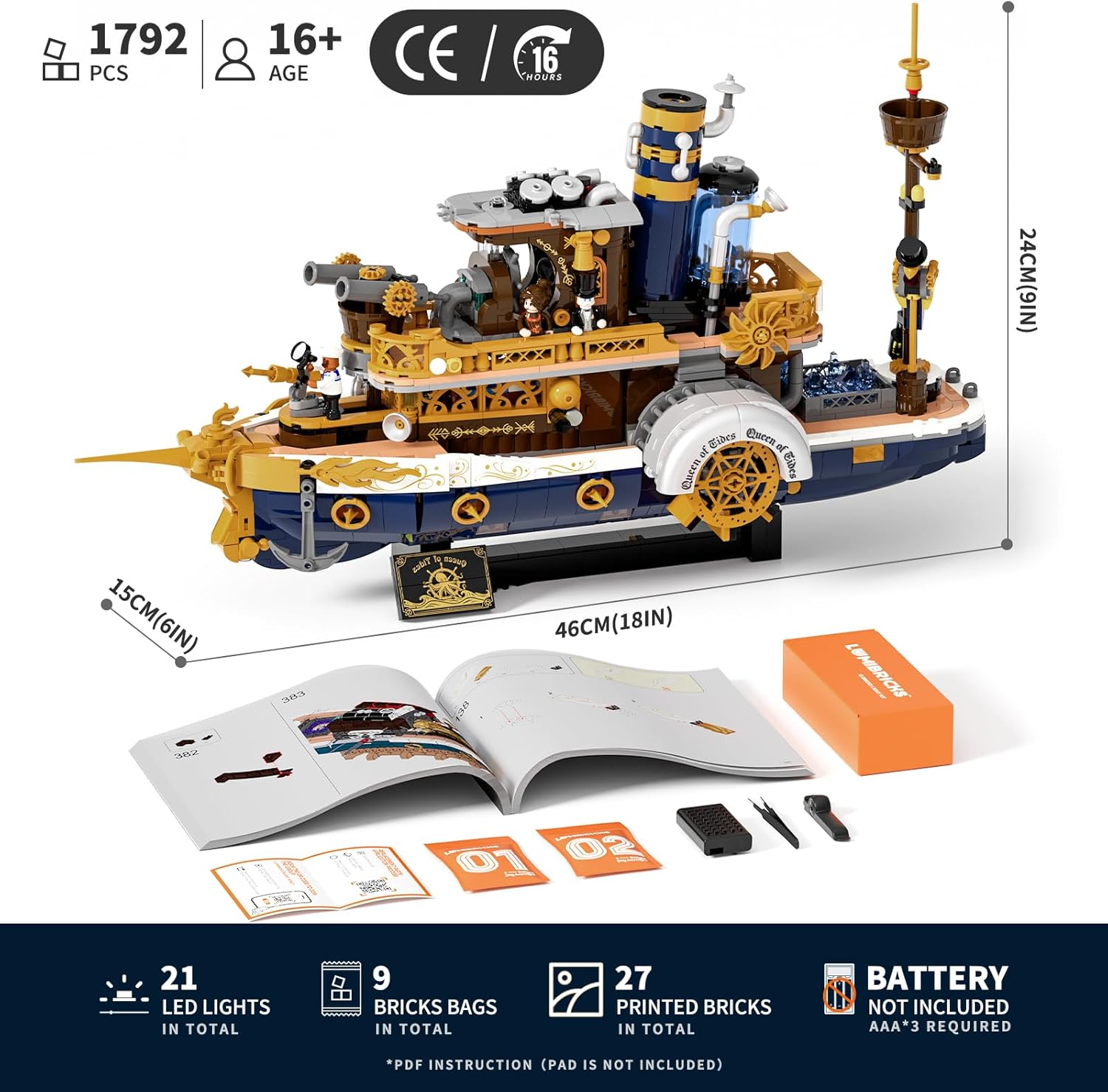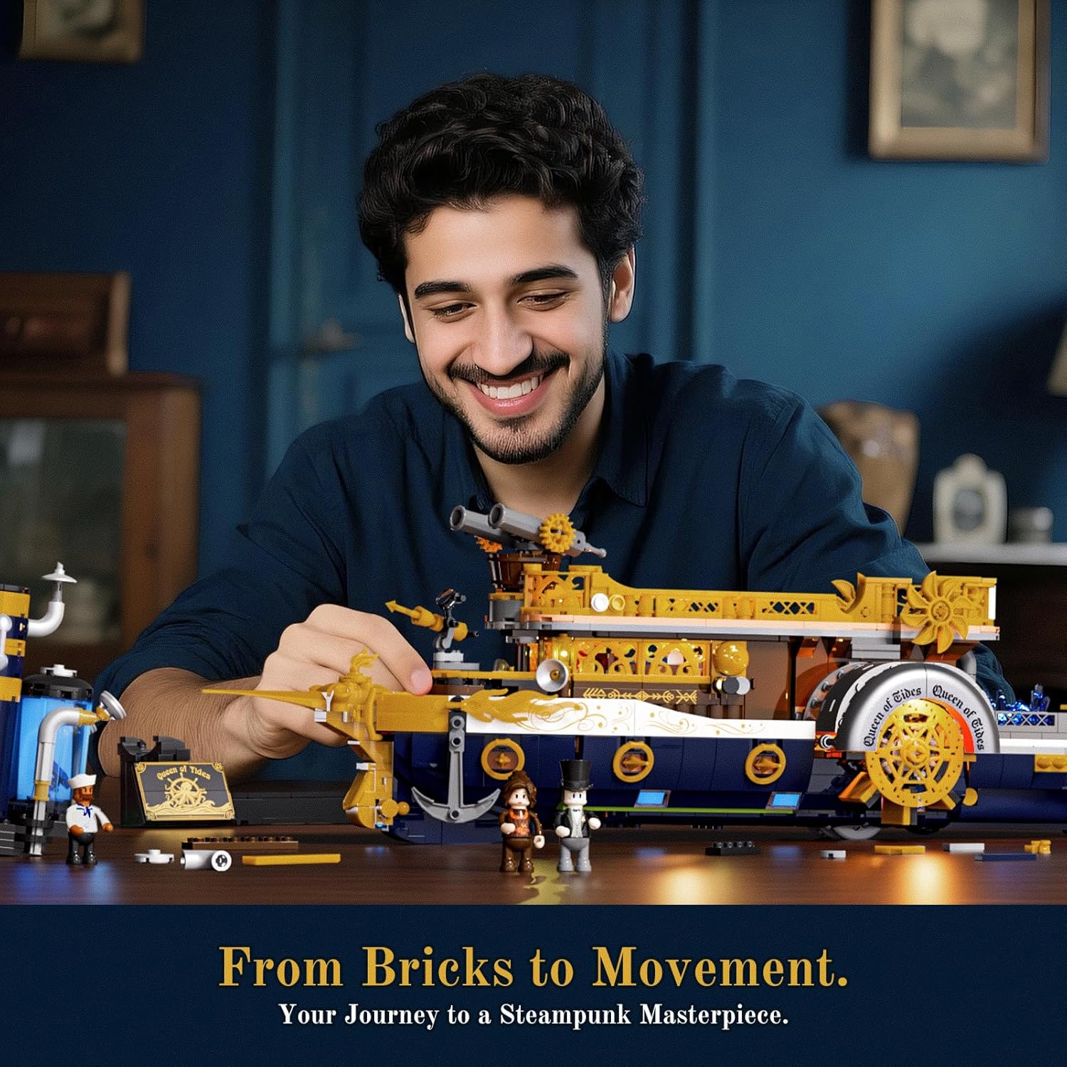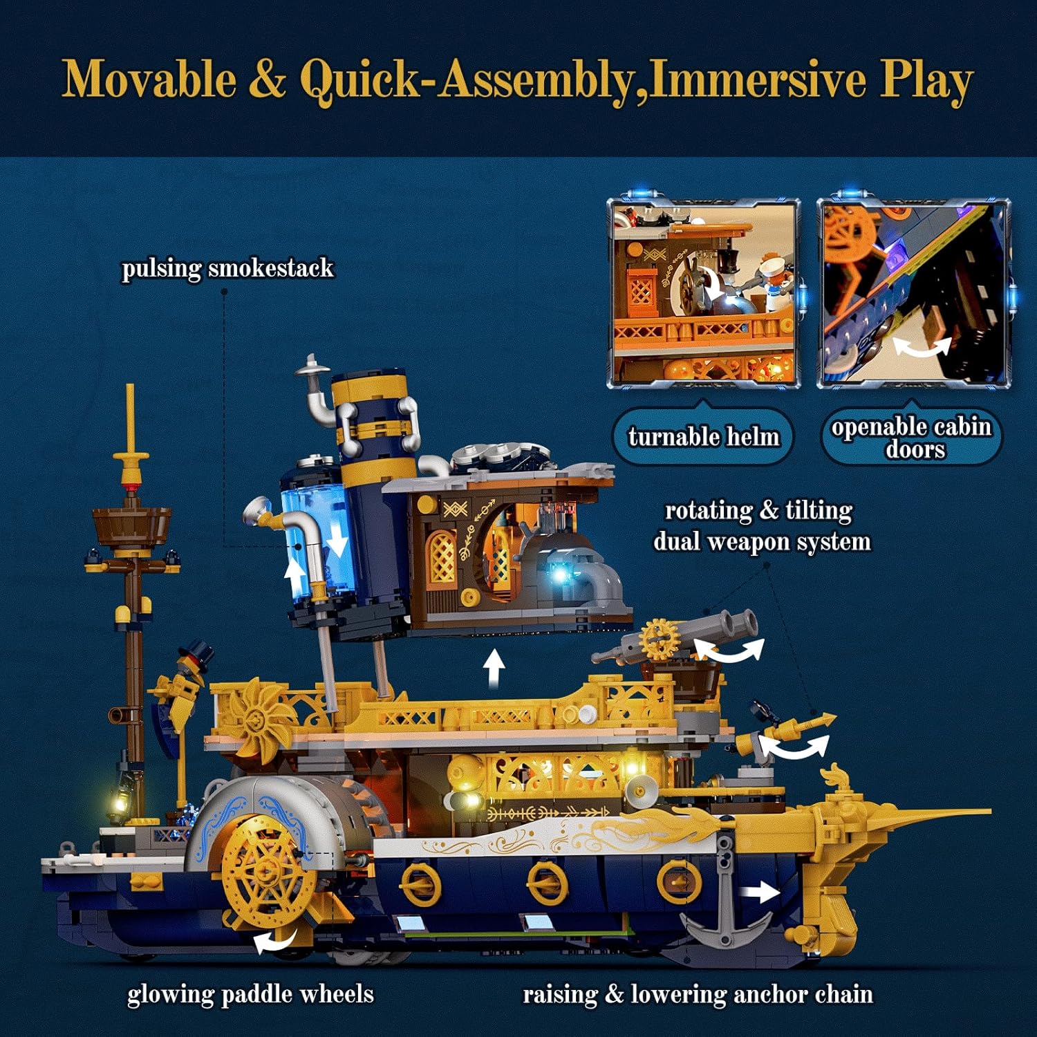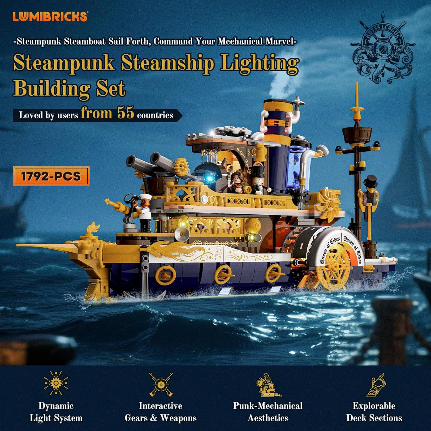 A Spectacle of Light and Steam: Featuring a dual-lighting system that blends warm white Victorian-era lamps with futuristic glowing crystal cores and hull-mounted blue LEDs, this ship creates a stunning visual narrative of classic steampunk meeting advanced technology. As the paddle wheels turn, light bleeds through their intricate cut-outs, immersing you completely in its mysterious voyage across neon-lit waters.