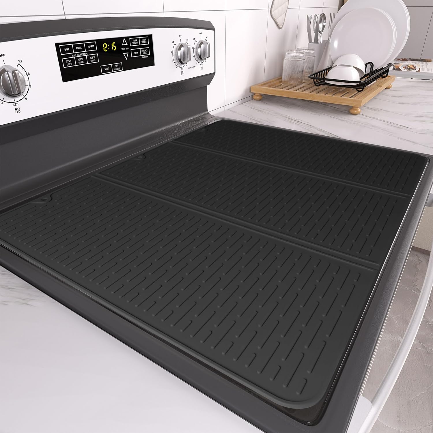 Glass Top Stove Cover:This extra large 28″ x 20″ inches silicone stove cover for glass top electric stove is perfect for protecting your electric stove top, kitchen counter top, electric cooktop, table, or washer-dryer top from scratches, spills, stains, scrapes, and dirt. It keeps the surface clean and tidy while providing an expandable workbench for food preparation.