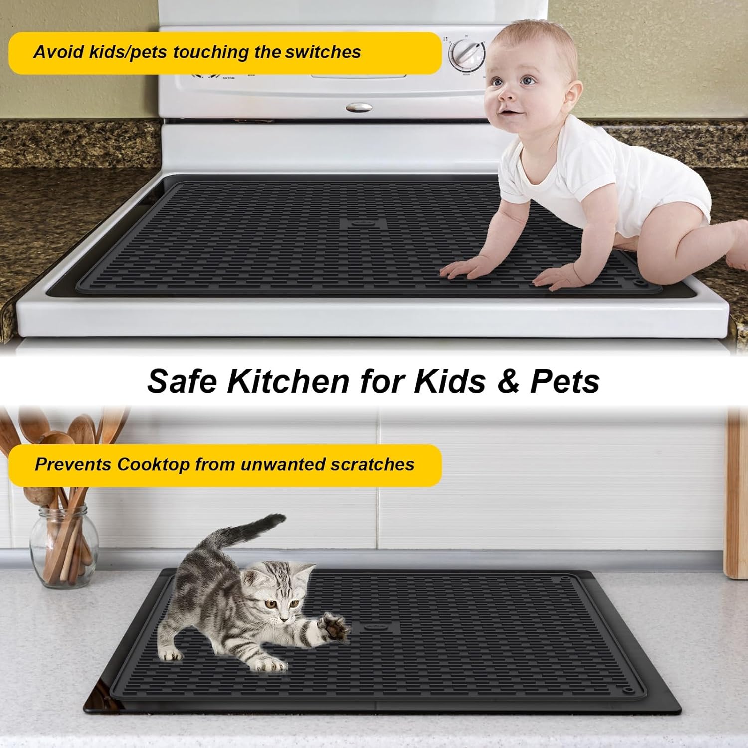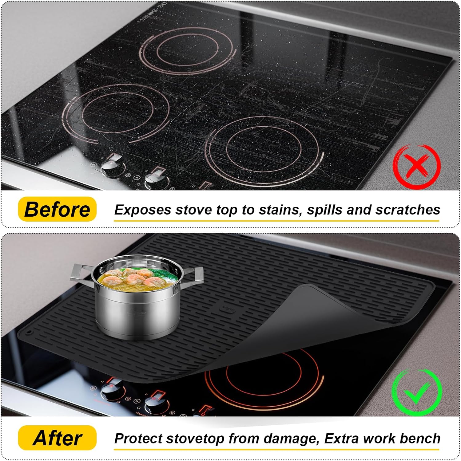 Electric Stove Top Cover: 28″ x 20″ Silicone stove mat protects your stove top, kitchen counter, electric cooktop, washer-dryer top from scratches, spills and stains. It keeps the surface clean and tidy while providing an expandable workspace.