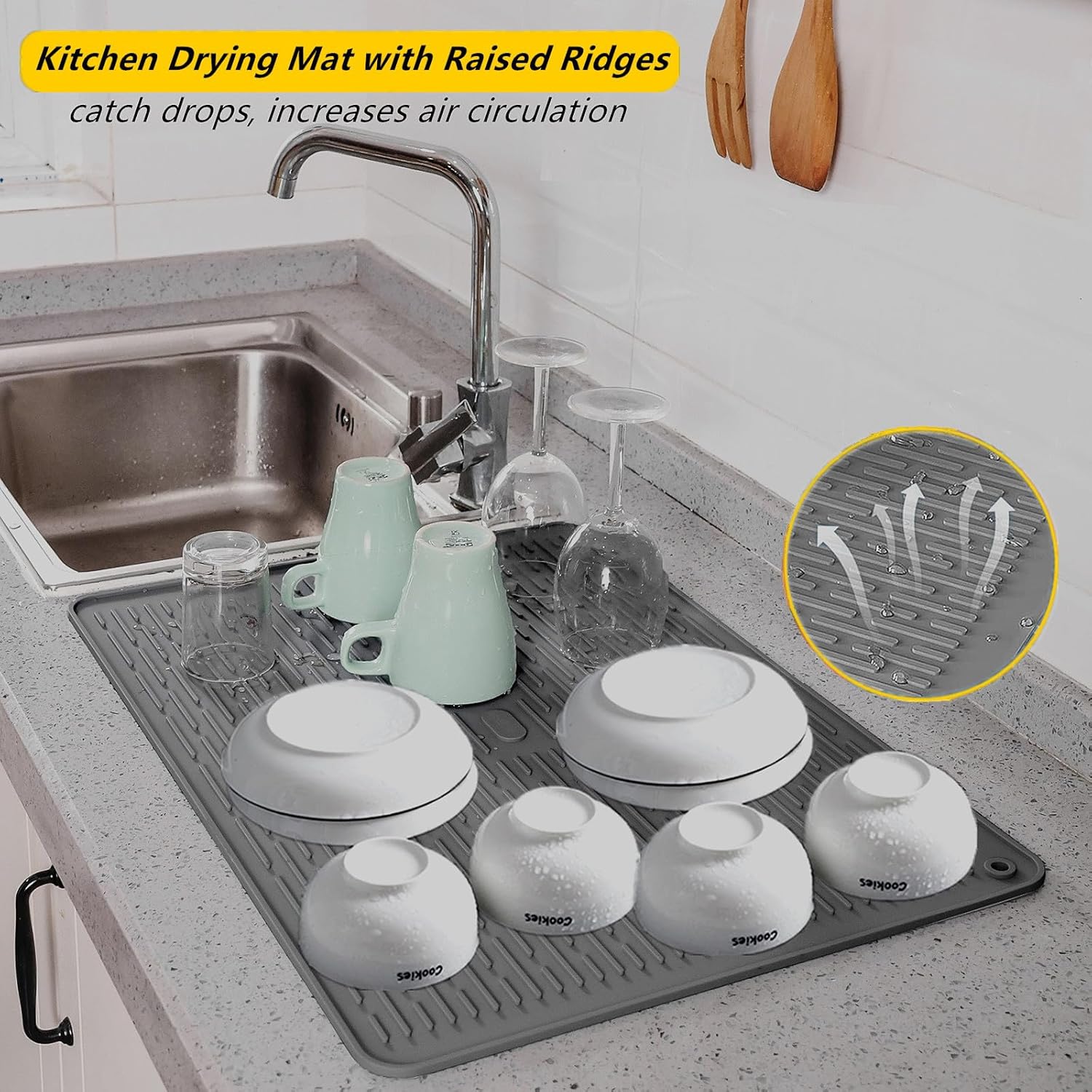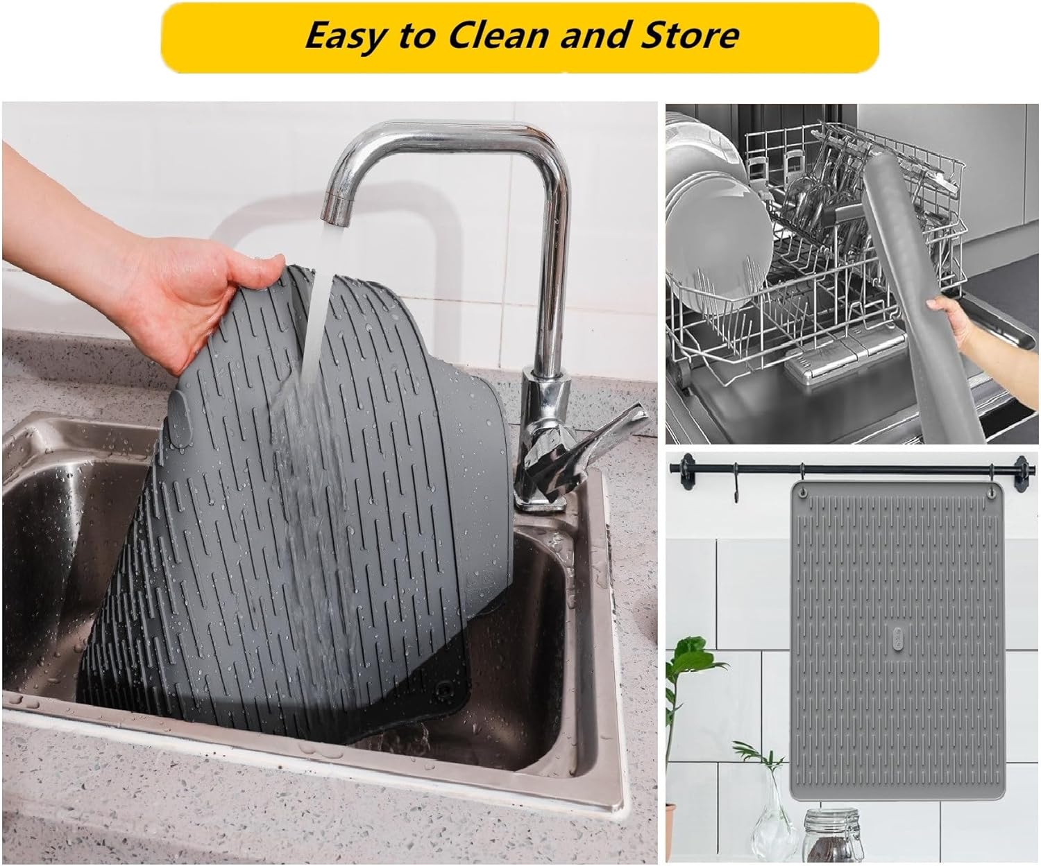 Extra Large Drying Mat: Drying mat has wide raised ridges improves ventilation, allows dishes, glasses, fruits to dry faster. Sidewall around can prevent spills, keeping countertops dry, making it the perfect dish drainer mat.