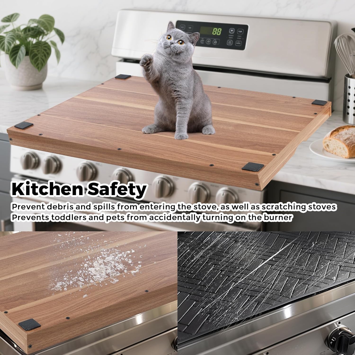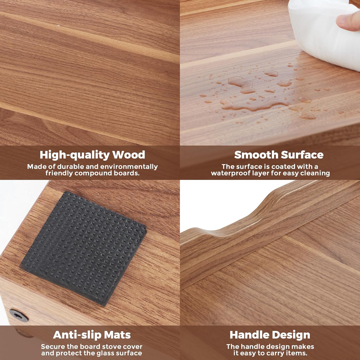 Premium Materials: Our stovetop covers are made of premium and environmentally friendly P2-grade CARB to ensure durability and longevity, each layer is composed of thickened particleboard, which can effectively prevent corrosion, warping and curling. The bottom of the stove burner covers is protected by a rubber strip, which can be placed firmly on the stovetop without slipping.