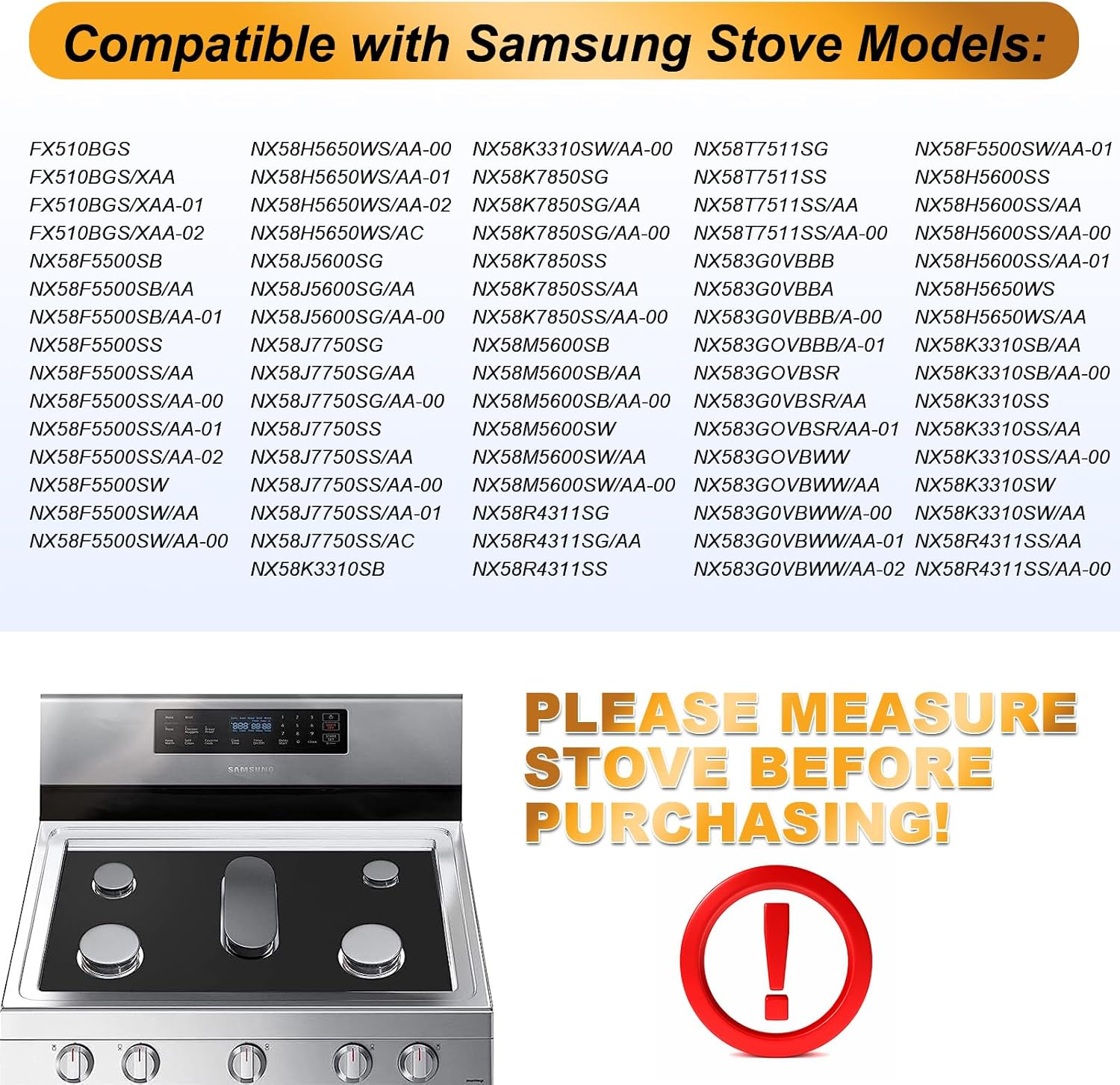 💪Stove Top Cover Compatibility: Fit for Samsung gas stove burner covers model FX510BGS/XAA NX58F5500SB/AA NX58F5500SS/AA NX58F5500SW/AA NX58H5600SS/AA NX58H5650WS/AA NX58J5600SG/AA NX58J7750SG/AA NX58J7750SS/AA NX58K3310SB/AA NX58K3310SS/AA NX58K3310SW/AA NX58K7850SG/AA NX58K7850SS/AA NX58M5600SB/AA NX58M5600SW/AA NX58R4311SG/AA NX58R4311SS/AA NX58R5601SG/AA NX58R5601SS/AA NX58T5601SB/AA NX58T5601SW/AA NX58T7511SG/AA NX58T7511SS/AA NX583G0VBBB/AA NX583G0VBSR/AA NX583G0VBWW/AA