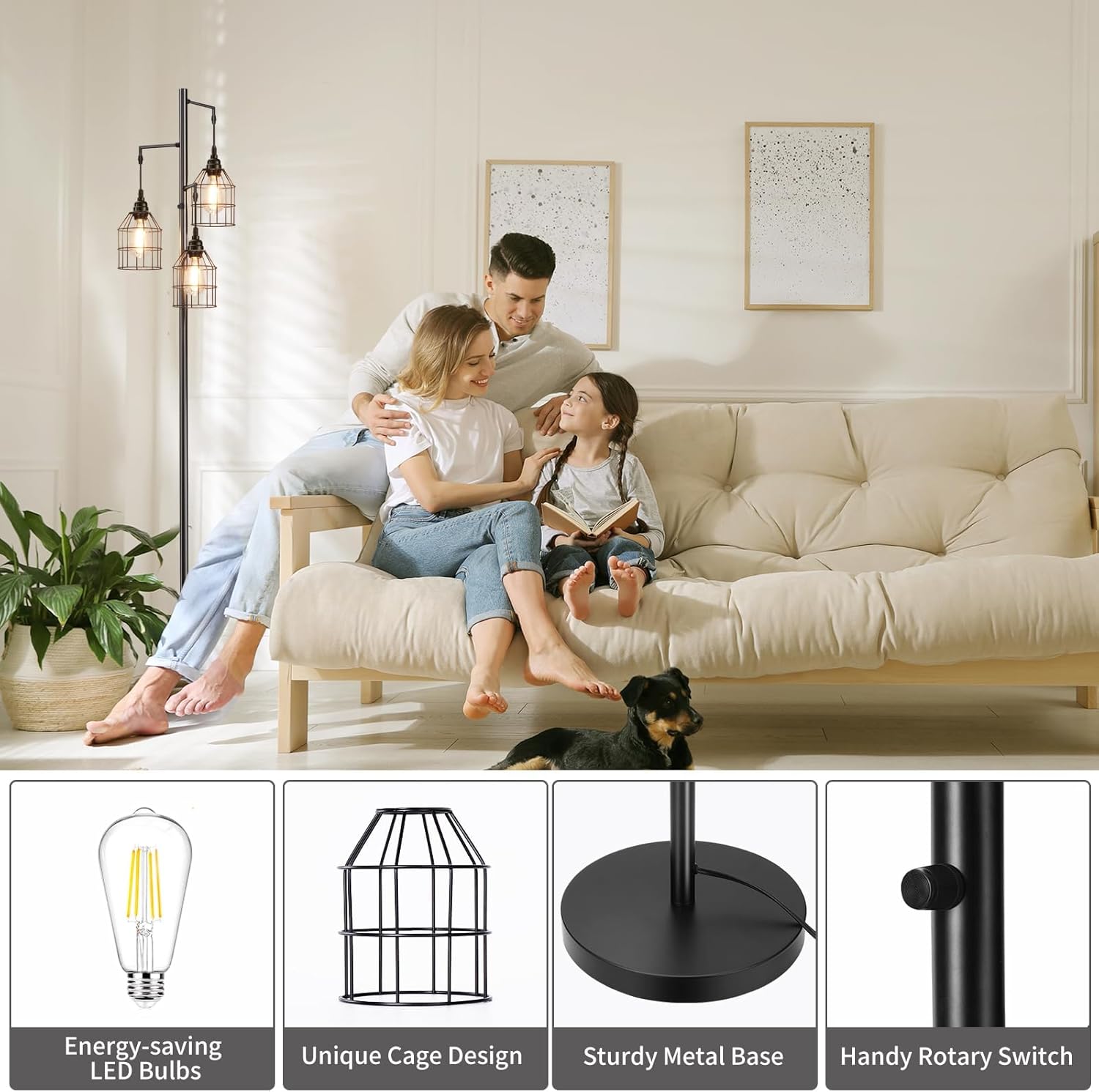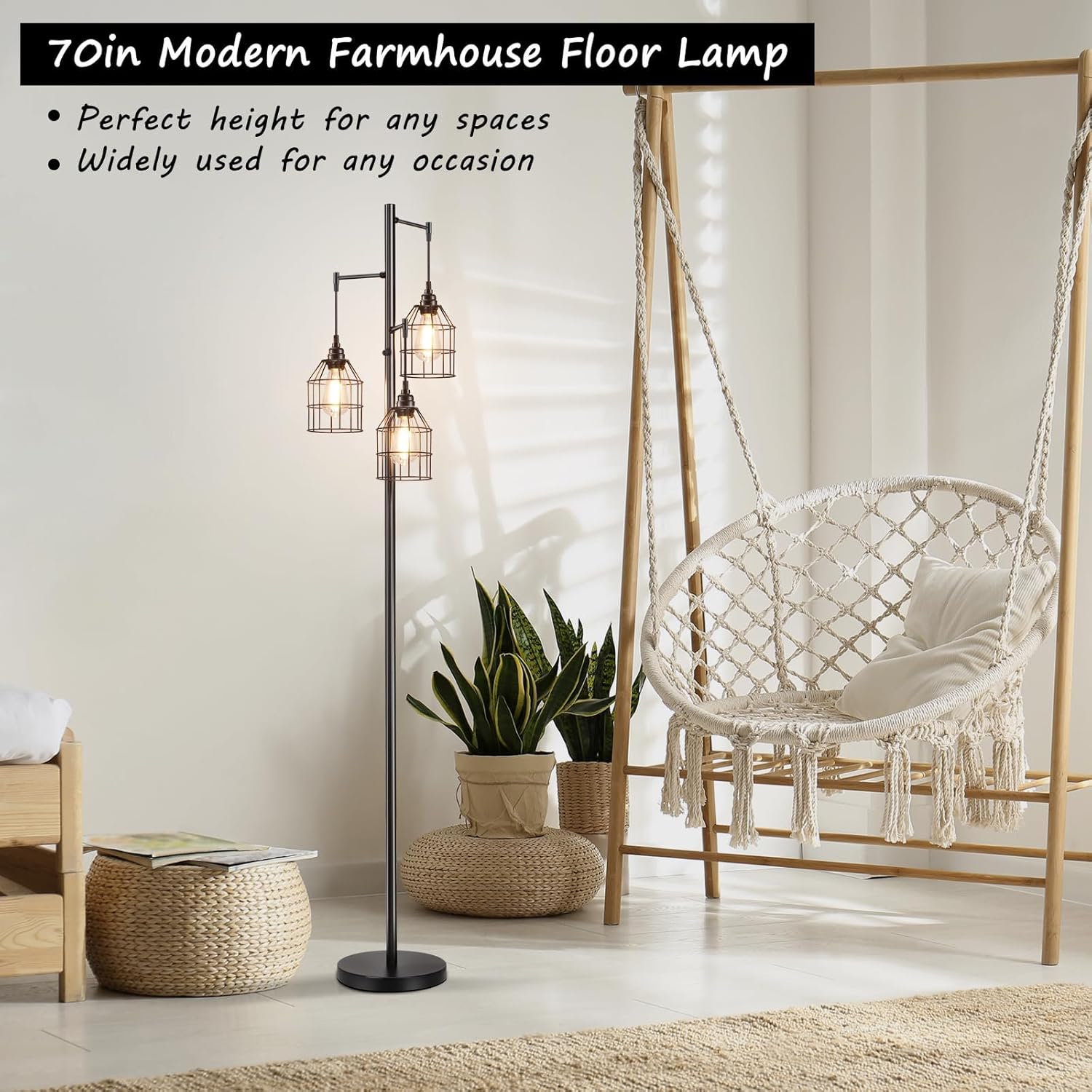 Sucolite 70″ Dimmable Floor Lamp for Living Room, Industrial 3-Light Tree Floor Lamp Black with Cages, Farmhouse Rustic Tall Standing Lamp Floor Lighting for Bedroom Office, 3 Free LED Edison Bulbs