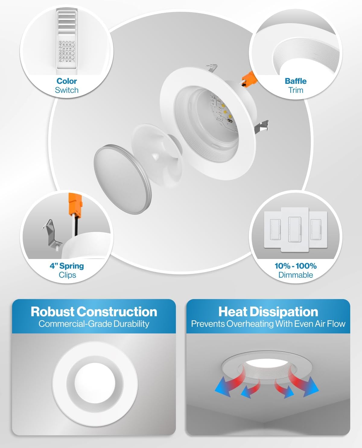 Sunco 4 Inch LED Recessed Lights, Retrofit Can Lighting, 660 LM, 11W (40W Equivalent), Selectable CCT 2700K/3000K/3500K/4000K/5000K, Dimmable, Baffle Trim, Replacement Conversion Kit UL 4 Pack