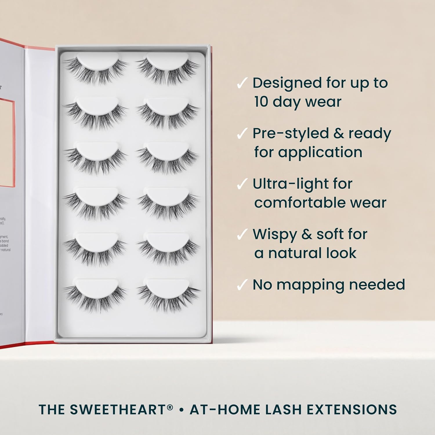 This kit includes 6 full lash sets of doll-eyed lash clusters. Each set lasts up to 10 days when paired with the recommended adhesive (sold separately).