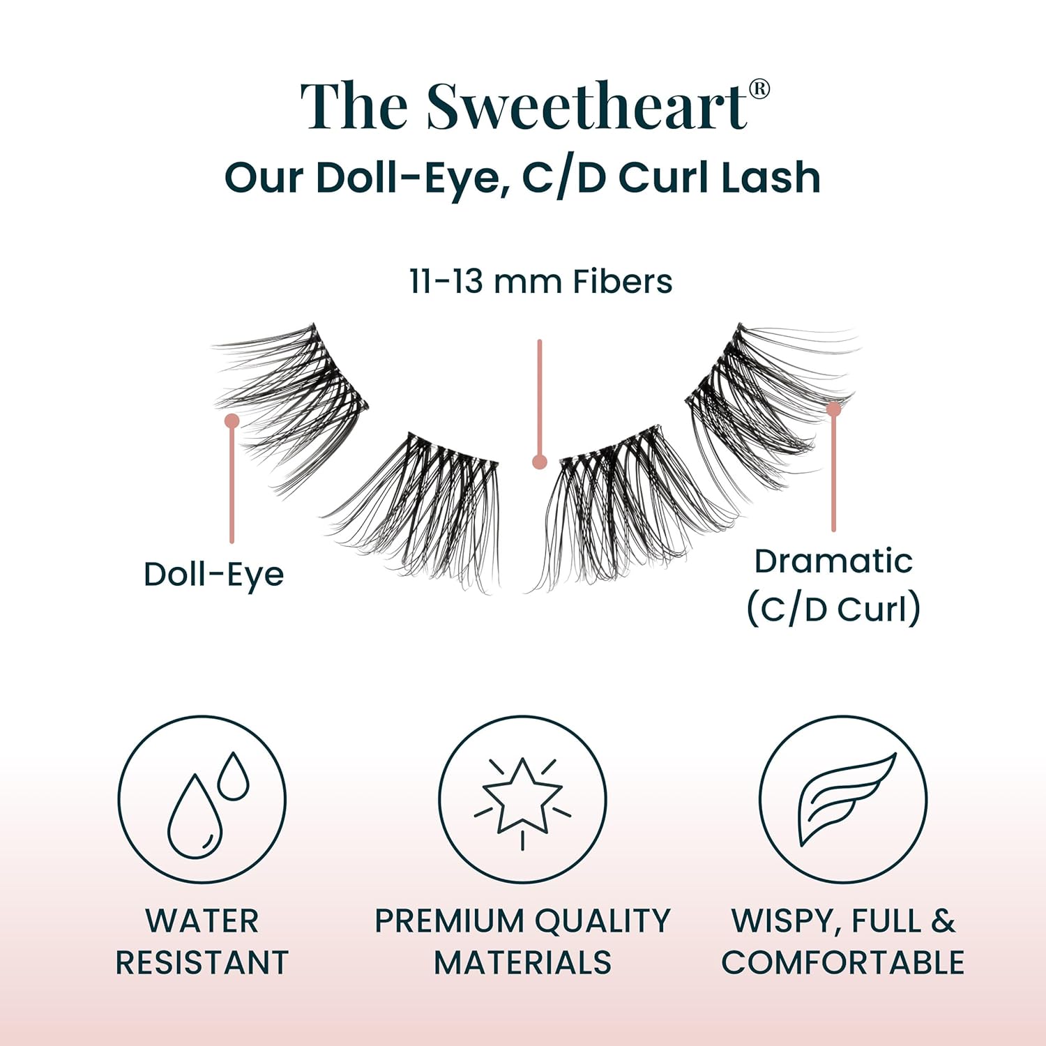 These lashes create a doll-eyed look—natural, full, and subtly flared. Lash lengths range from 11mm to 13mm for balanced volume.