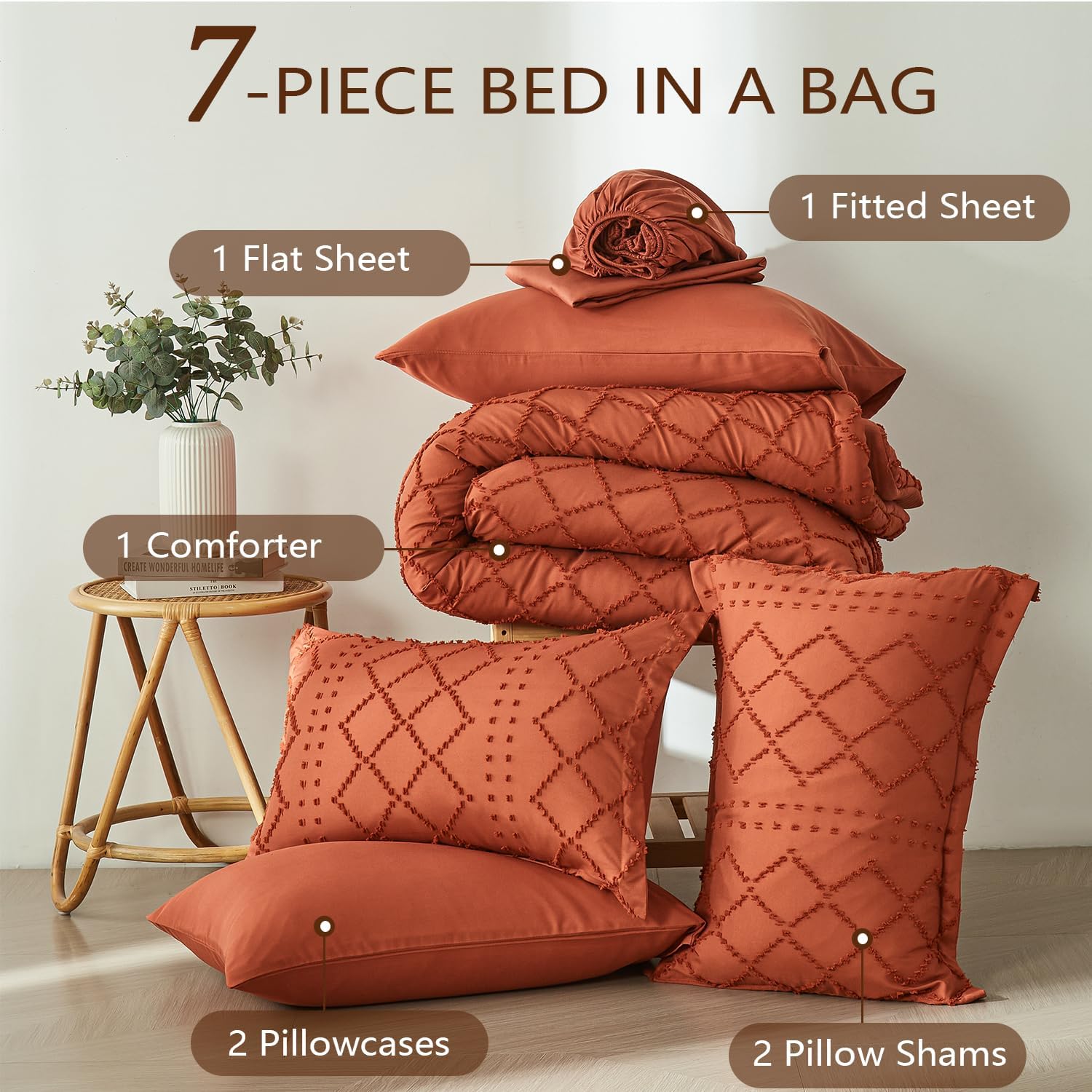 King Comforter Set: You can get a 7-piece tufted comforter set king size with 1 comforter(102″x90″),1 flat sheet(108″x102″),1 fitted sheet(78″x80″+18″),2 pillow cases(20″x40″),2 pillow shams(20″x36″).Tips:Due to vacuum-sealed packaging,the king bed set will be shrinked or wrinked,you can expose it to sunlight and tap gently,it will re-fluffed nicely after hours.