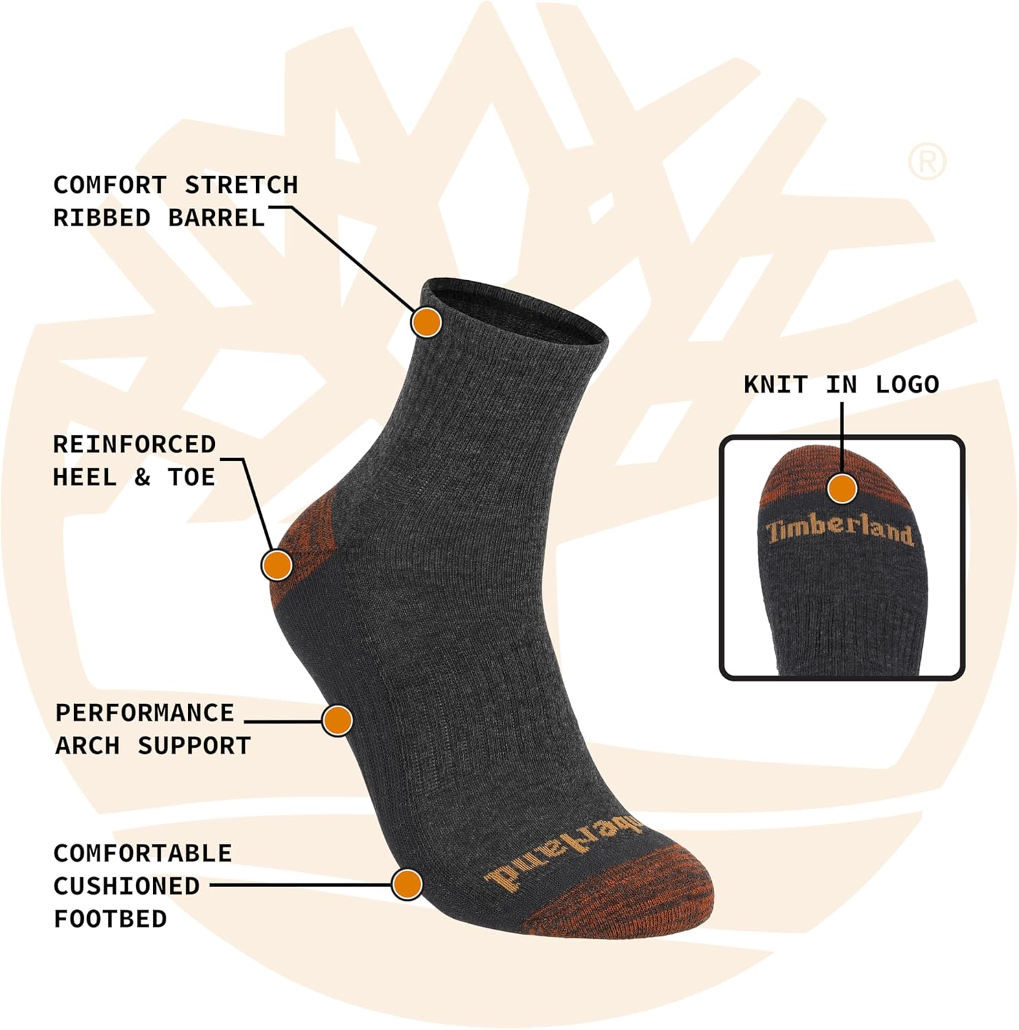 Timberland Mens Socks, Comfort Quarter Socks, Arch Support, Padded Cushion, Moisture Control (Size 7-12, Assorted 6 Pack). FEATURES: Timberland quarter socks for men are made with you in mind. These men’s socks provide you with additional arch support, a padded cushion, and moisture control. MULTI-USE MEN’S SOCKS: Our quarter socks provide versatility for many different situations. They are active socks for things like exercising, hiking or going on adventures or can be used as casual socks and mens work socks. EMBRACE ADVENTURE: These socks are made to accompany you where life takes you. If you are looking for hiking socks men look no further. Our goal is make your life a little easier and more comfortable while you live each day to the best of your ability. HIGH QUALITY: Our men socks are made of 70% Poly, 28% Cotton socks for men, and 2% Spandex. These high quality materials make our mens socks durable and long lasting without sacrificing comfort and functionality. Trusted Brand: Timberland socks for men are designed to look great, perform and last long. Be comfortable knowing you are getting a product from a brand that many around the world love