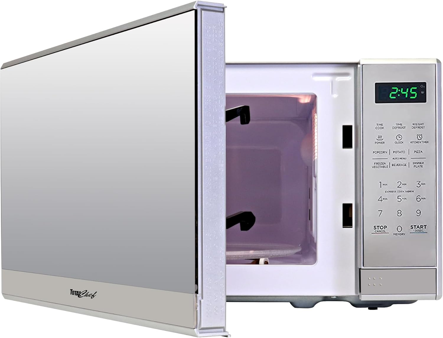 DIGITAL TOUCH CONTROLS & CLEAR LED DISPLAY – Confidently control your total chef microwave oven using the simple digital touchscreen controls on a sleek mirrored background. the clear led display ensures easy readability, and the child safety lock prevents unsupervised operation, adding an extra layer of safety.