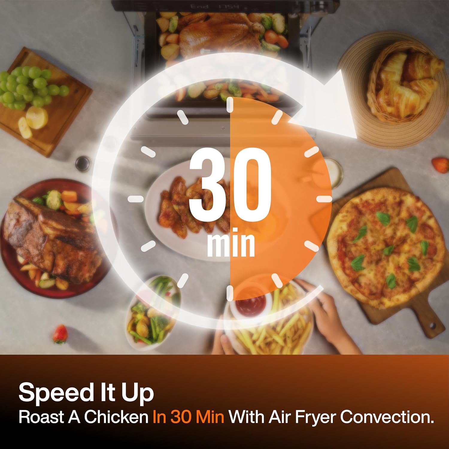 360° Turbo Convection System: Air fry wings, fries, or veggies with minimal oil for a golden, crispy exterior while keeping the inside tender and juicy. Dual heating elements and a 2400 RPM fan circulate heat in a full 360° for faster, more even cooking, roasting dishes up to 30% quicker than traditional ovens. Perfect for healthier, chef-quality results