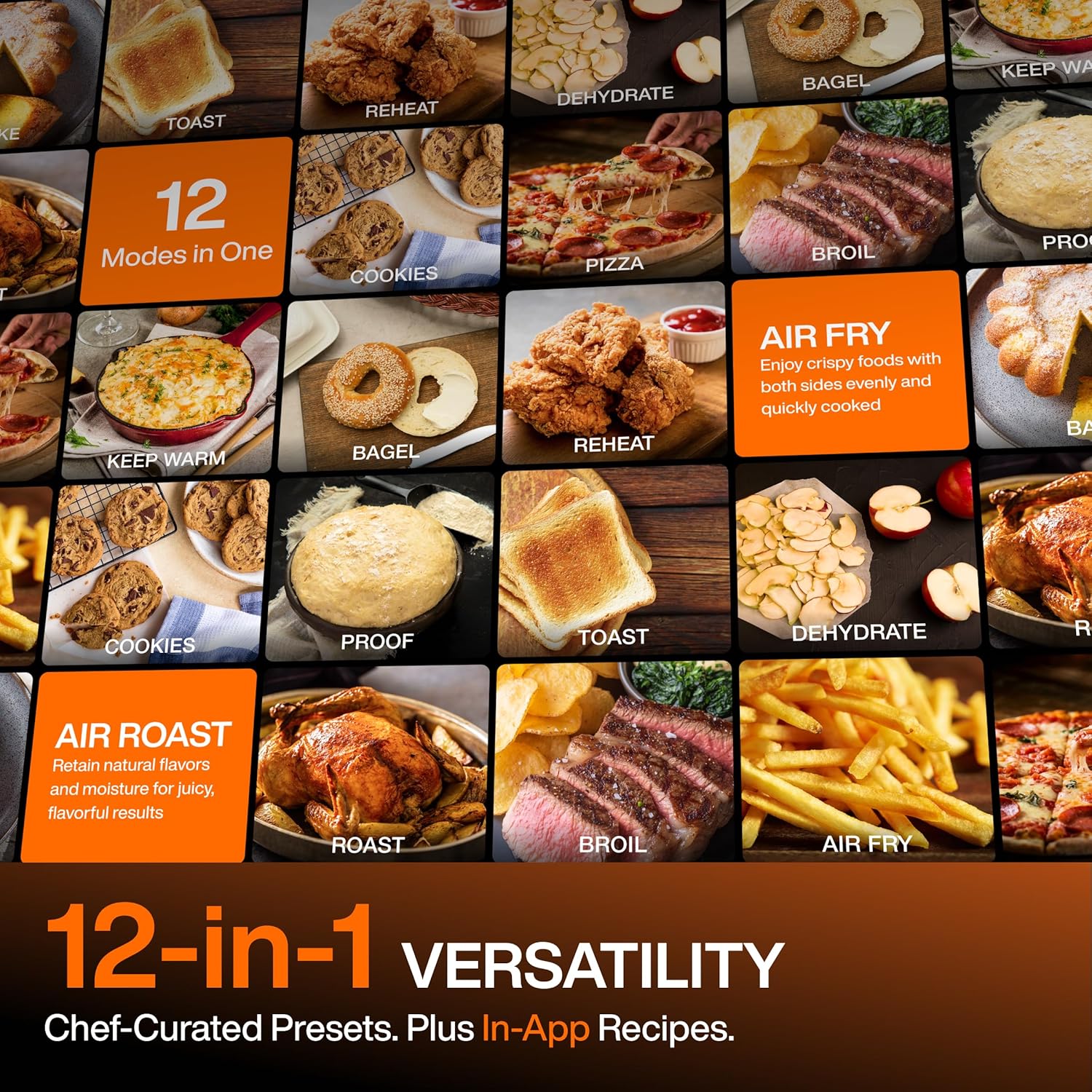 12-in-1 Cooking Versatility: With a wide temperature range of 85–450℉ and 3 fan speeds, the oven offers 12 cooking modes (Roast, Bake, Air Fry, Broil, Pizza, Cookies, Toast, Bagel, Proof, Reheat, Dehydrate, Keep Warm) and 5 probe presets (Beef, Fish, Pork, Lamb, Poultry). Access approximately 35 step-by-step app recipes plus 15 printed recipes, with app recipes continuously updated for inspiration and guidance