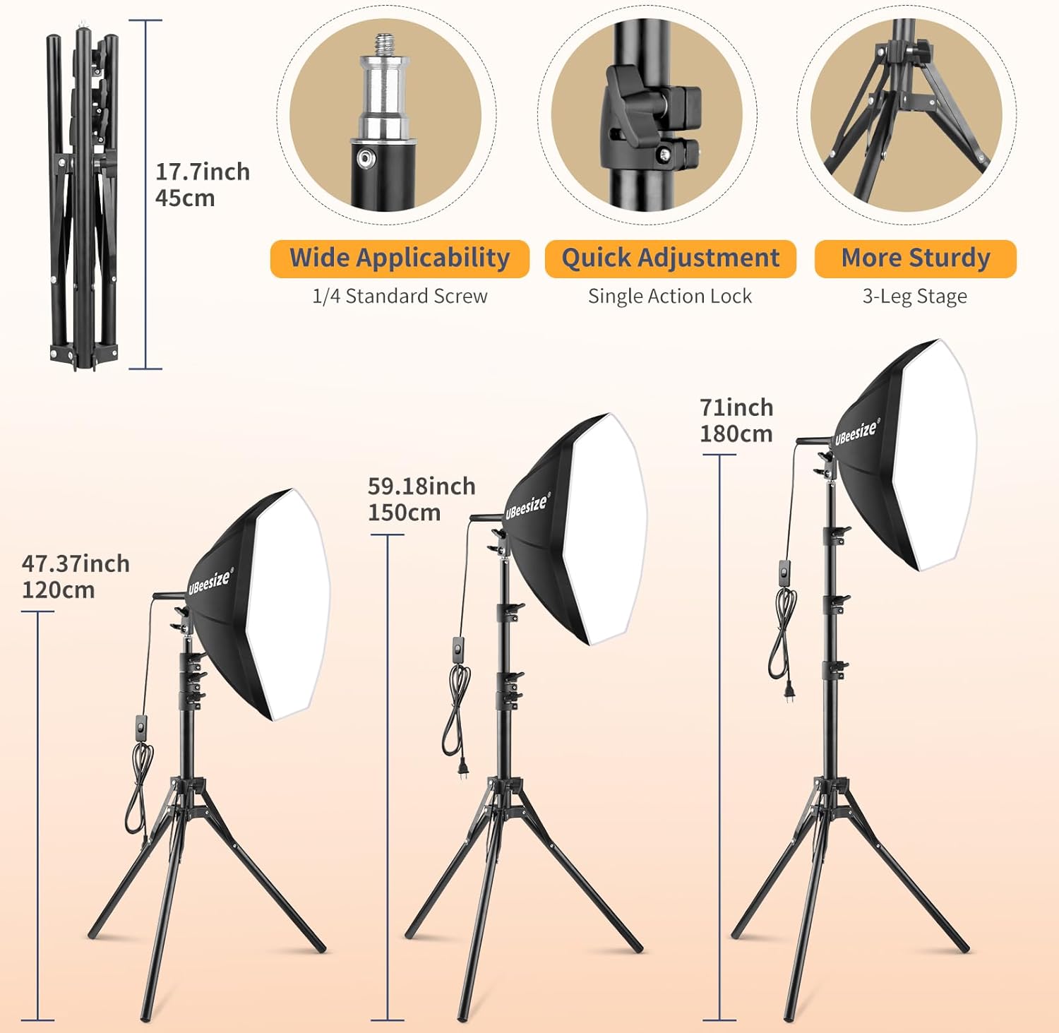 【Illuminate Your Creativity】 UBeesize softbox lighting kit is made of high-quality PET fabric and a foldable nylon cover, which has high reflectivity, softer and even light, and a wider range of illumination. The inner baffle of silver particles built into the lampshade makes the light cast evenly, which maximizes the soft light ability and eliminates shadows