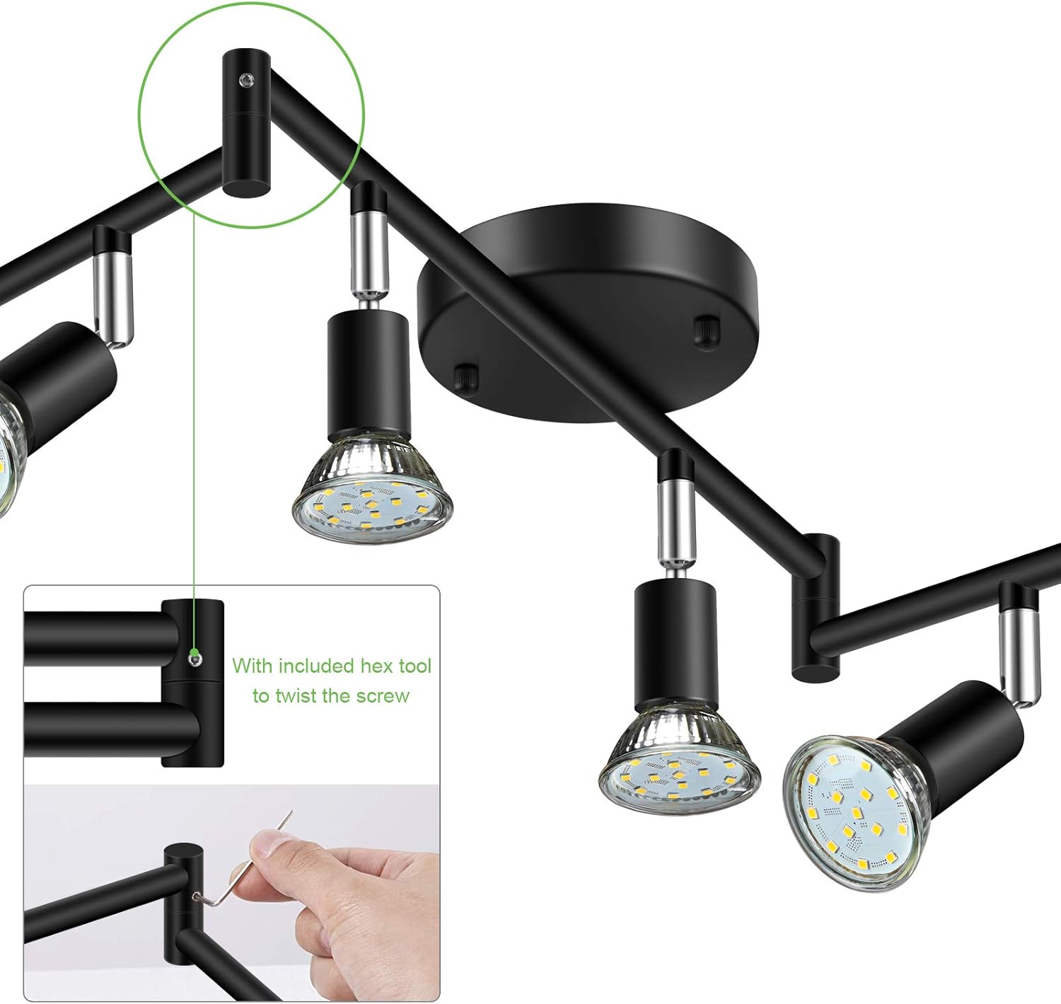 The lamp arms of this track lighting can be adjusted. With the hex tool included in the package, you can adjust the direction of the lamp arm as you want.