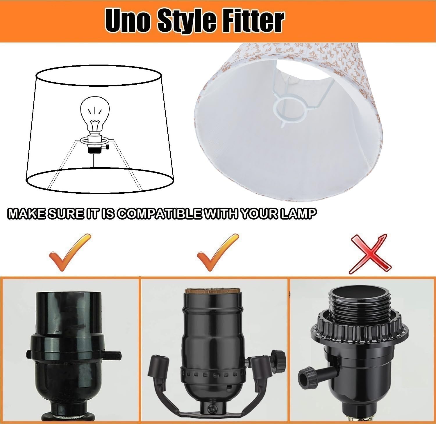 【Uno Fitter Type】Equipped with 3-Way Uno bridge fitter, the lampshade is designed to rest on the uno socket.Our cotton fabric lampshades offer a simple and classic look to work with a variety of styles and decors.The natural fabric diffuses light and minimizes glare, offering a pleasant ambiance and warm lighting to any corner of the room.