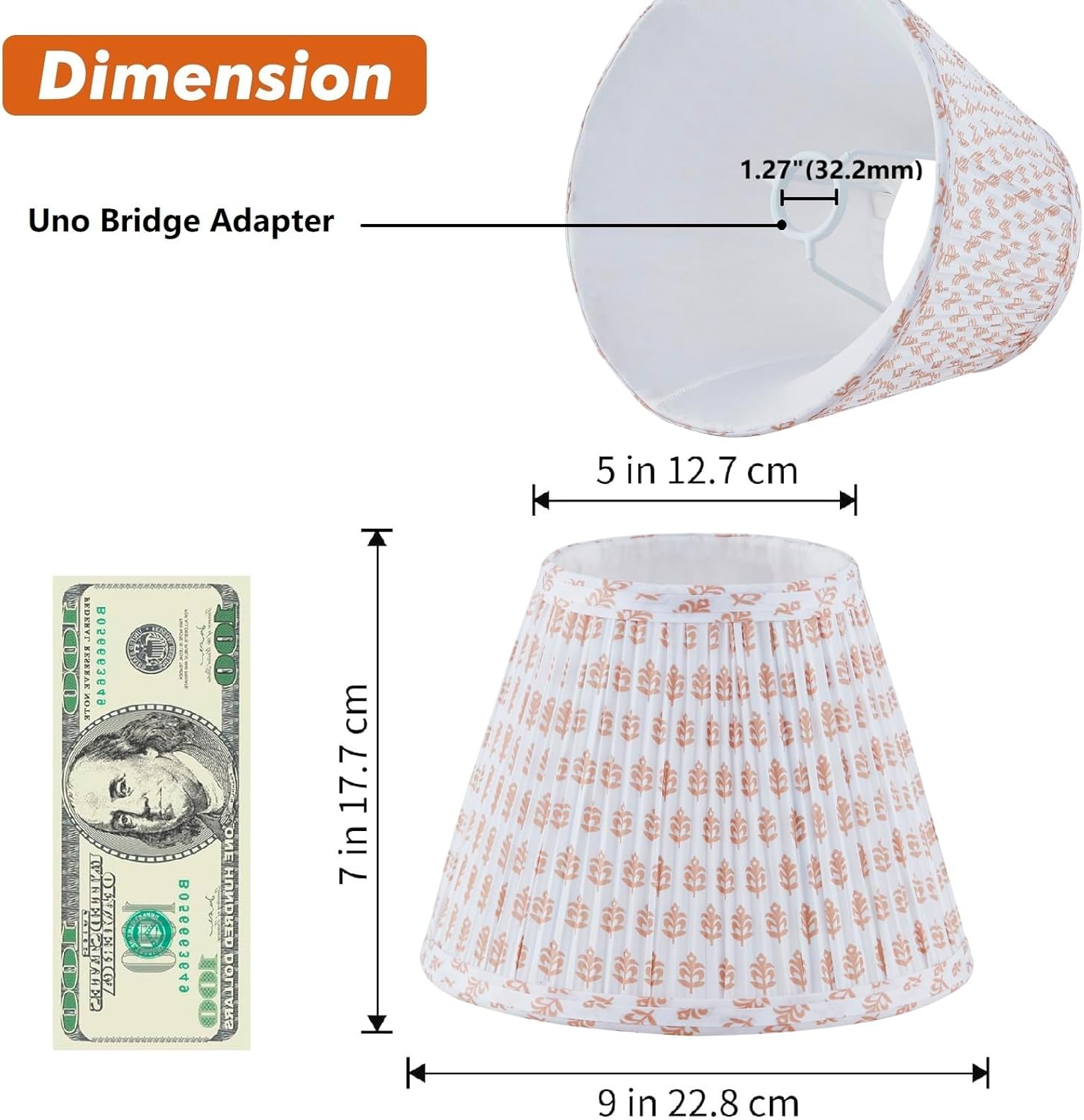 【Lampshade Dimension】5″ Top x 9″ Bottom x 7″ Slant Height , Material: pleated natural fabric.The center threaded Uno fitter diameter: 1 1/4″ inch. Small size suits many table lamps,uno lamp socket. liquor bottle lamp kit and floor lamps,Please check the uno lamp shade size carefully to make sure it is suitable for your light fixtures before purchasing.Package includes: 1 x Uno Lamp Shade.
