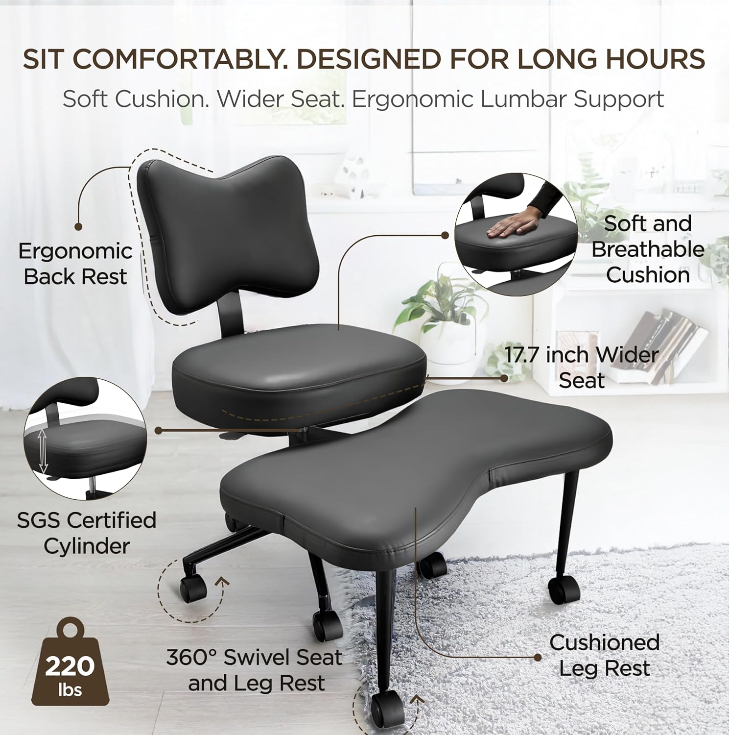 Reduces knee strain, promotes hip flexibility, and adds variety to long sitting periods.