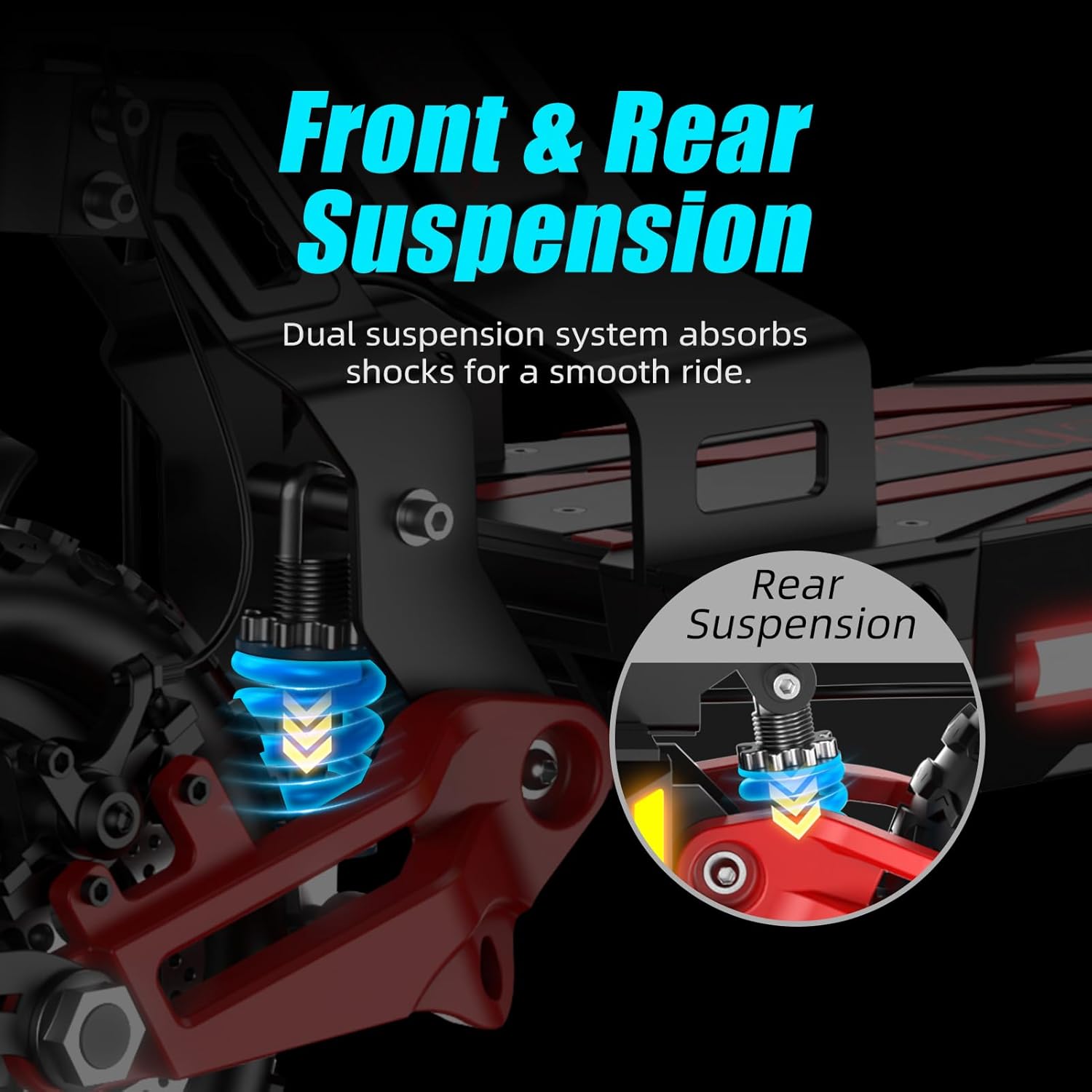 ✅ Dual Suspension & Braking System – Features advanced front and rear shock absorbers for a smooth, stable ride. Paired with front and rear disc brakes, this fast electric scooter ensures safe and responsive stopping power.