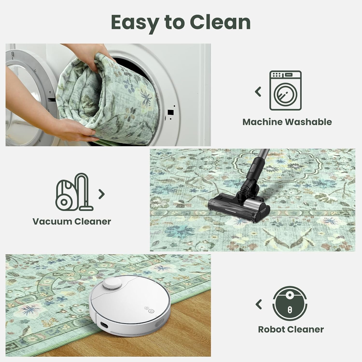 Easy Maintenance: Made of 100% polyester,machine washable or wipe up spills directly, suitable for families with pets and children. Low-power vacuums can also easily remove dust and snack crumbs, and sweeping robots can travel on them without any problems