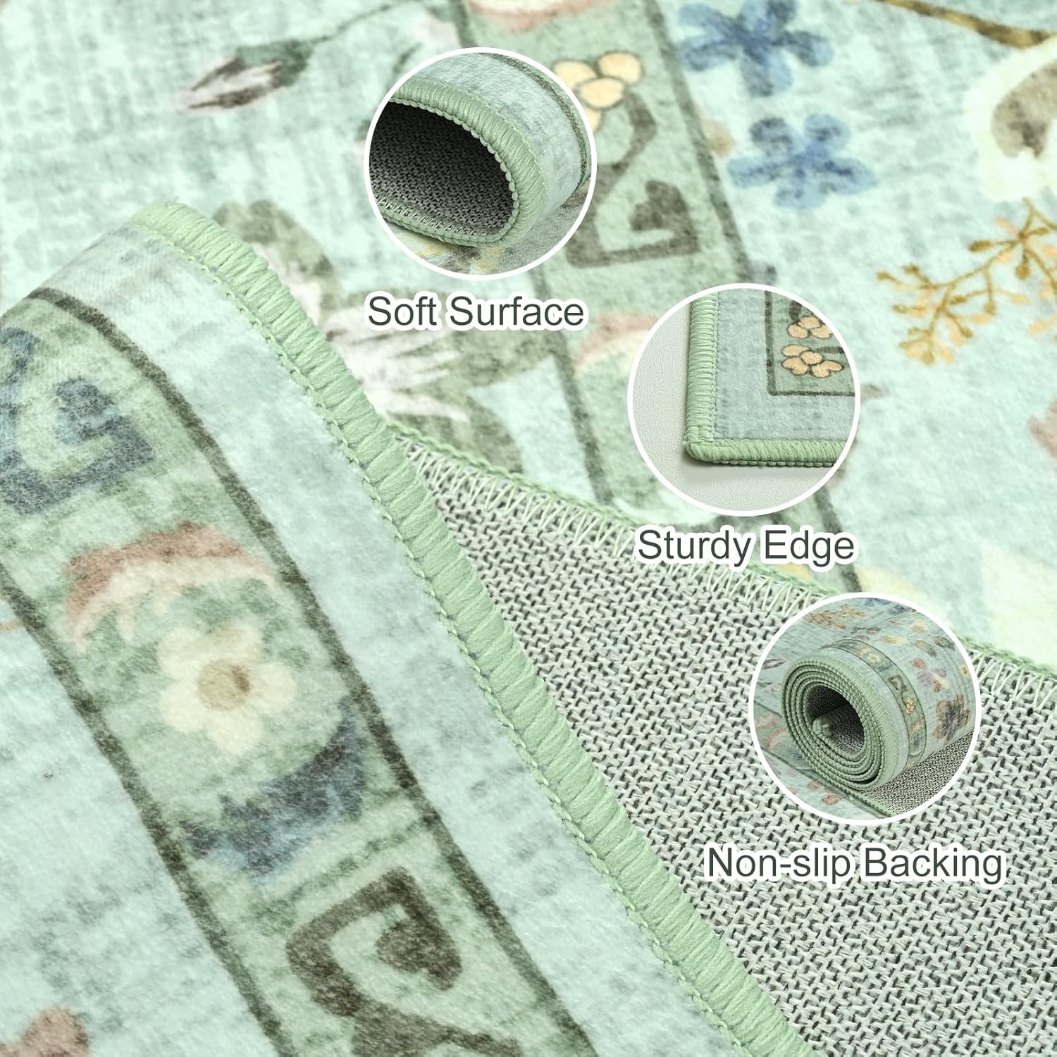 Non-Slip Backing & Reinforced Edging: This kitchen rugs features TPR rubber backing to stay securely in place, preventing slips for kids and seniors. It also protects hardwood and laminate floors. Reinforced edging ensures a longer lifespan for carpets