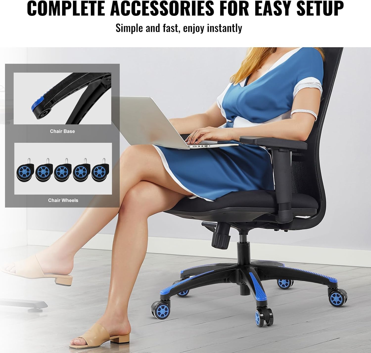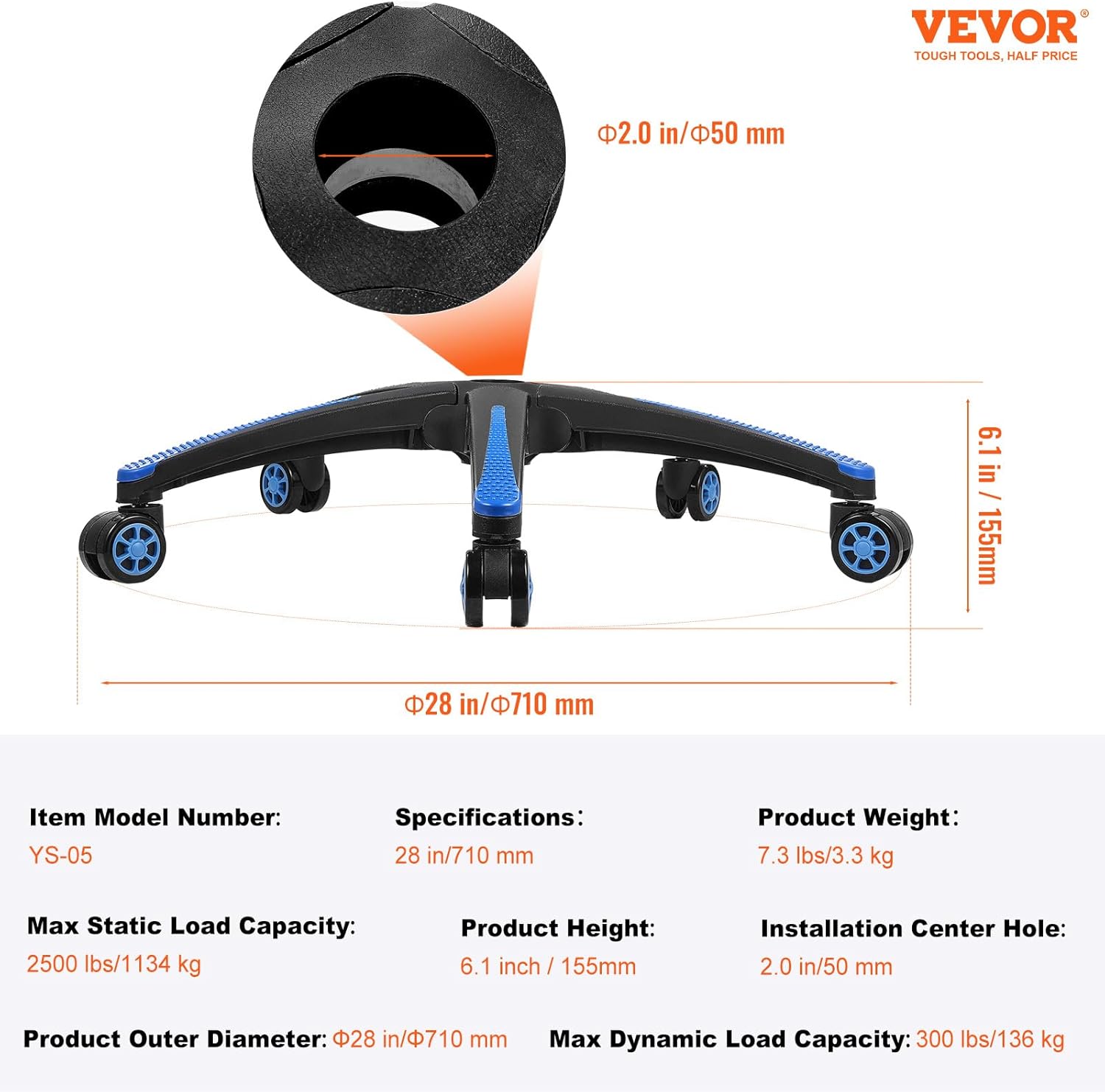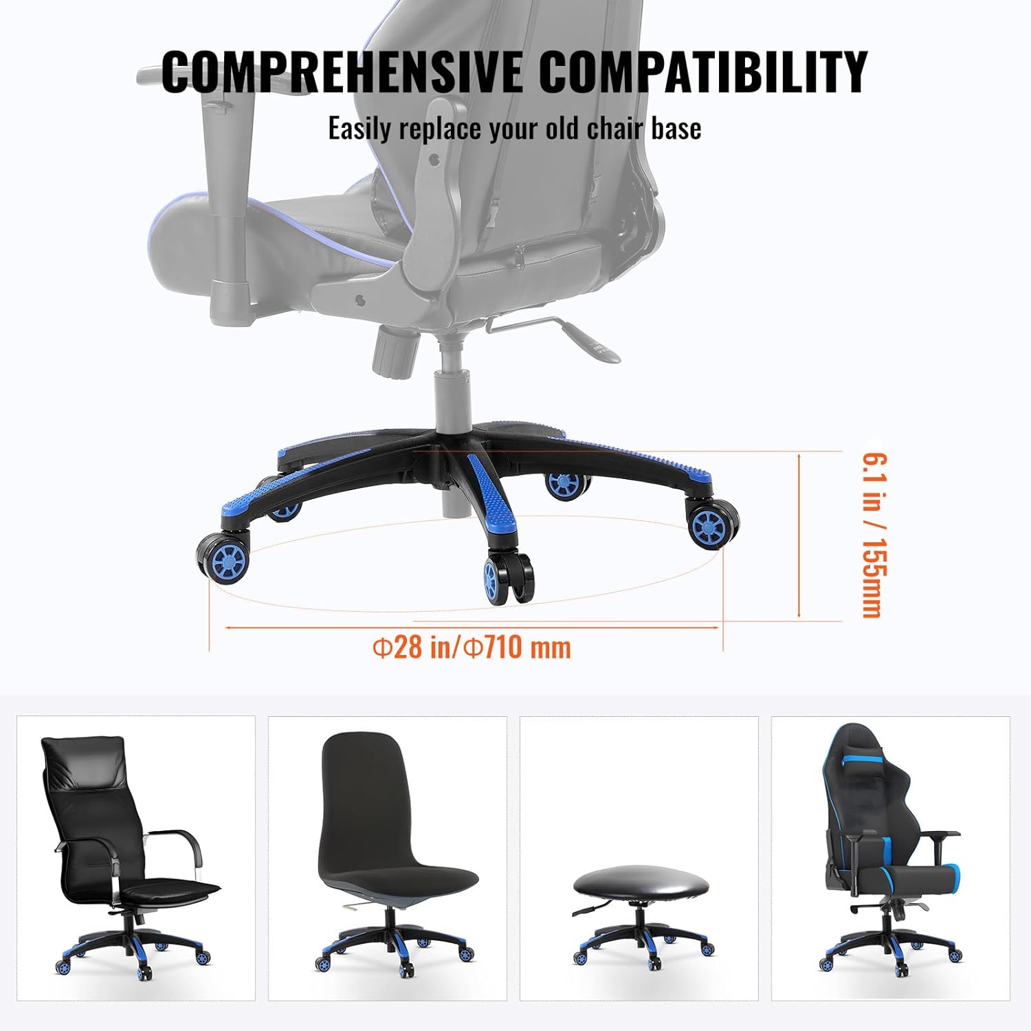 VEVOR Office Chair Base Replacement, 28″, 2500 lbs Static Load, Heavy Duty Universal Computer Desk Chair Stool Base Part with 5 Casters and Reinforced Legs, Desk Chair Base Replacement, Black + Blue