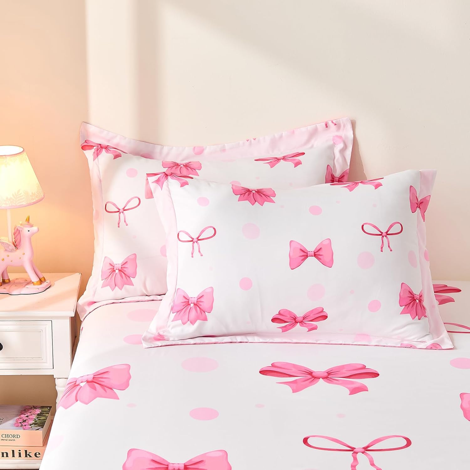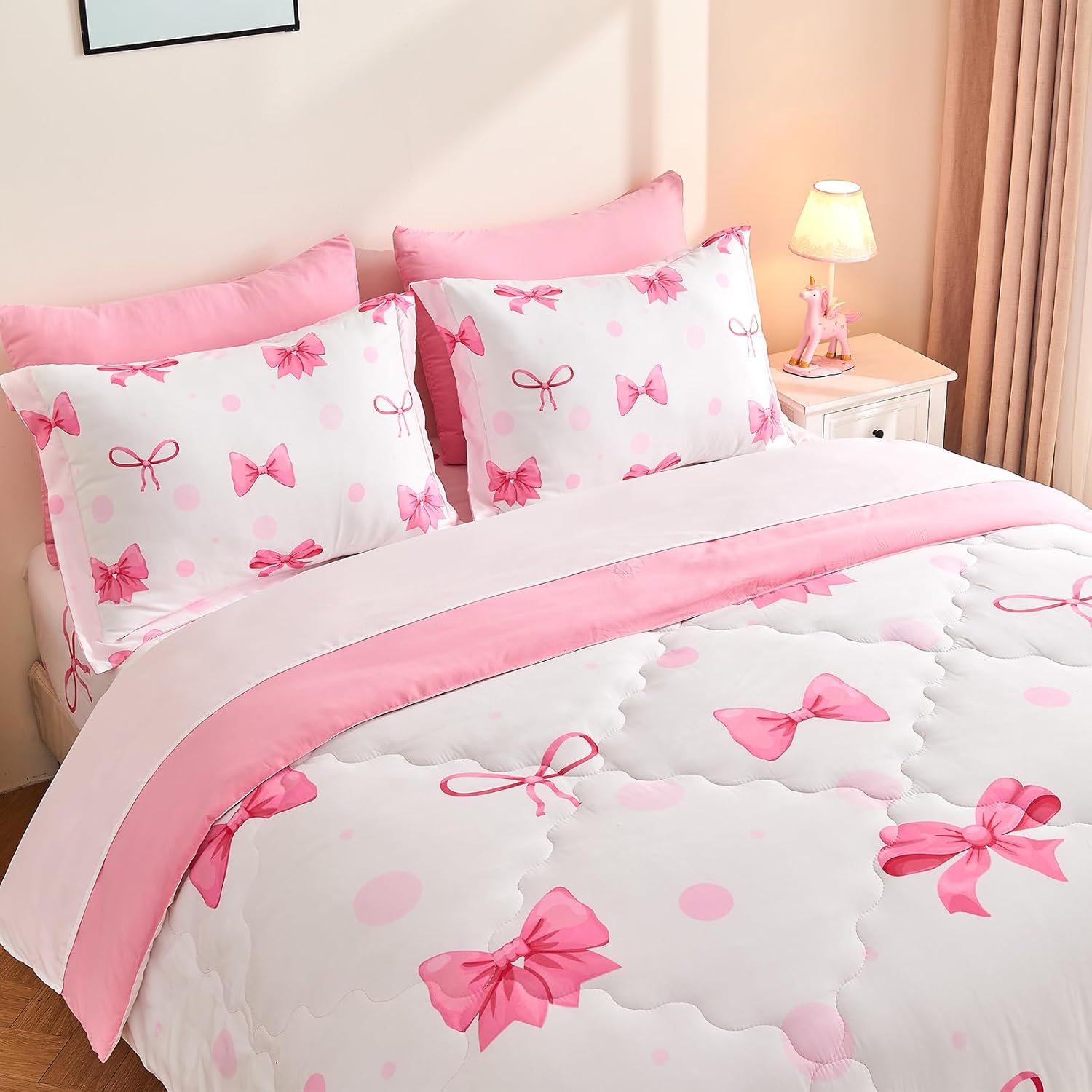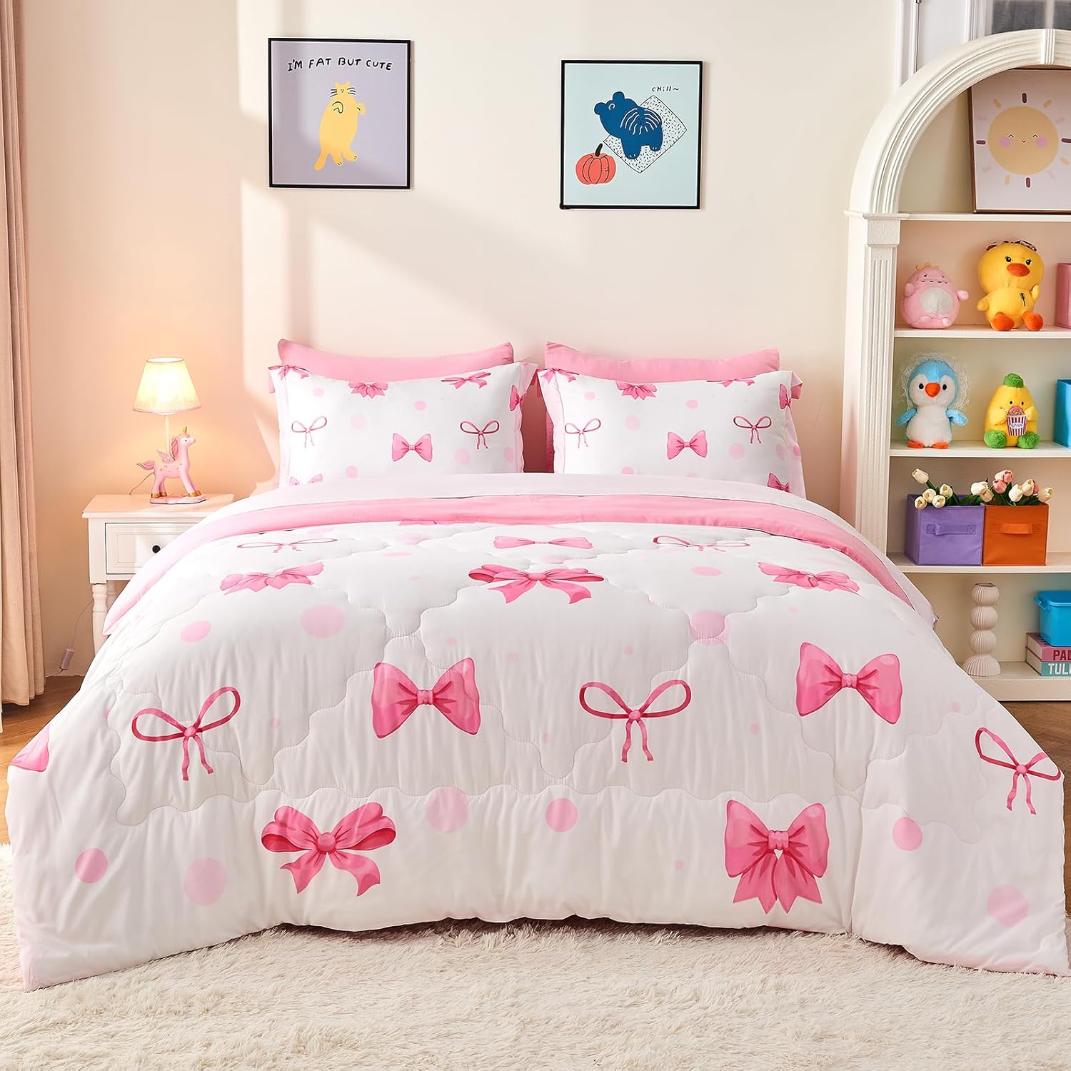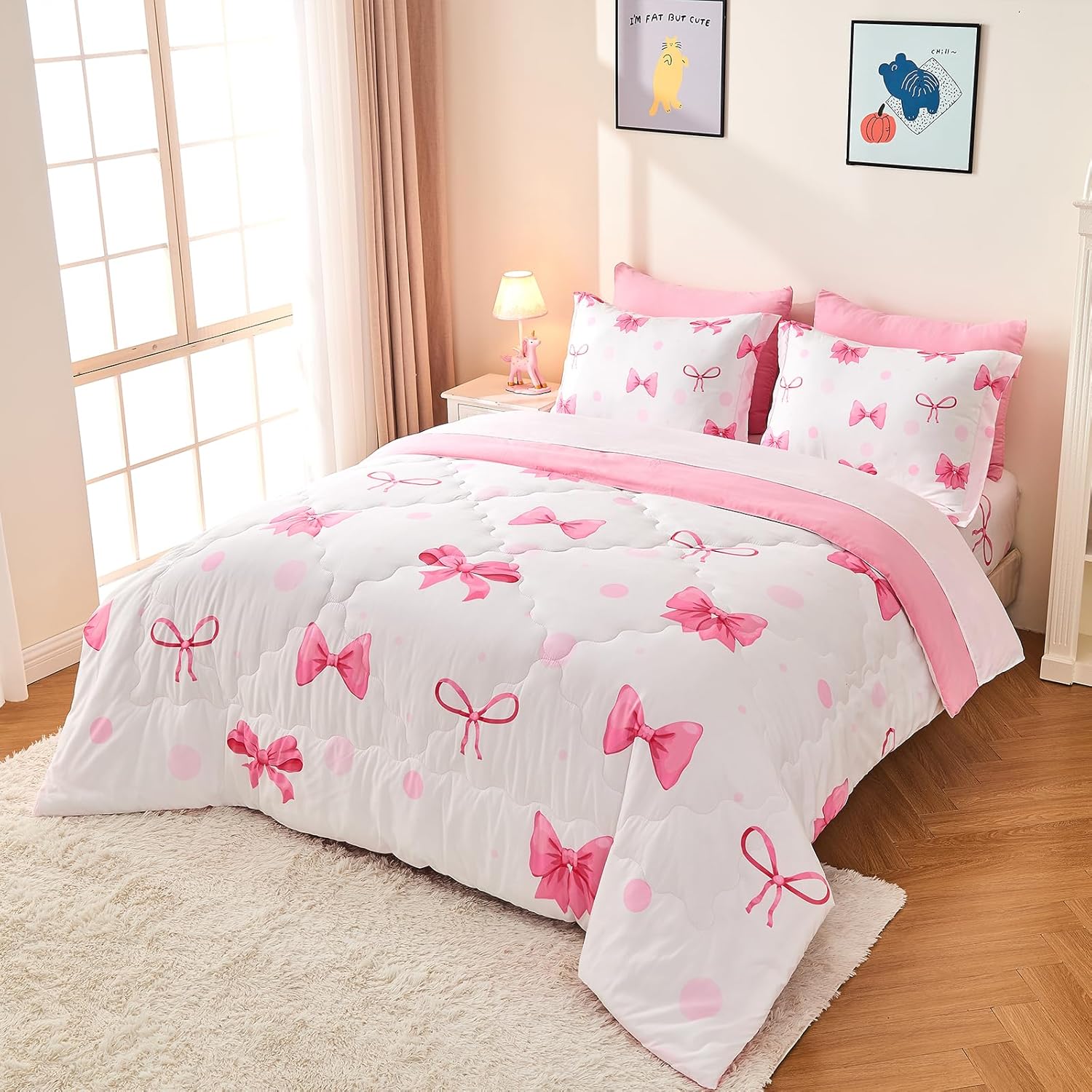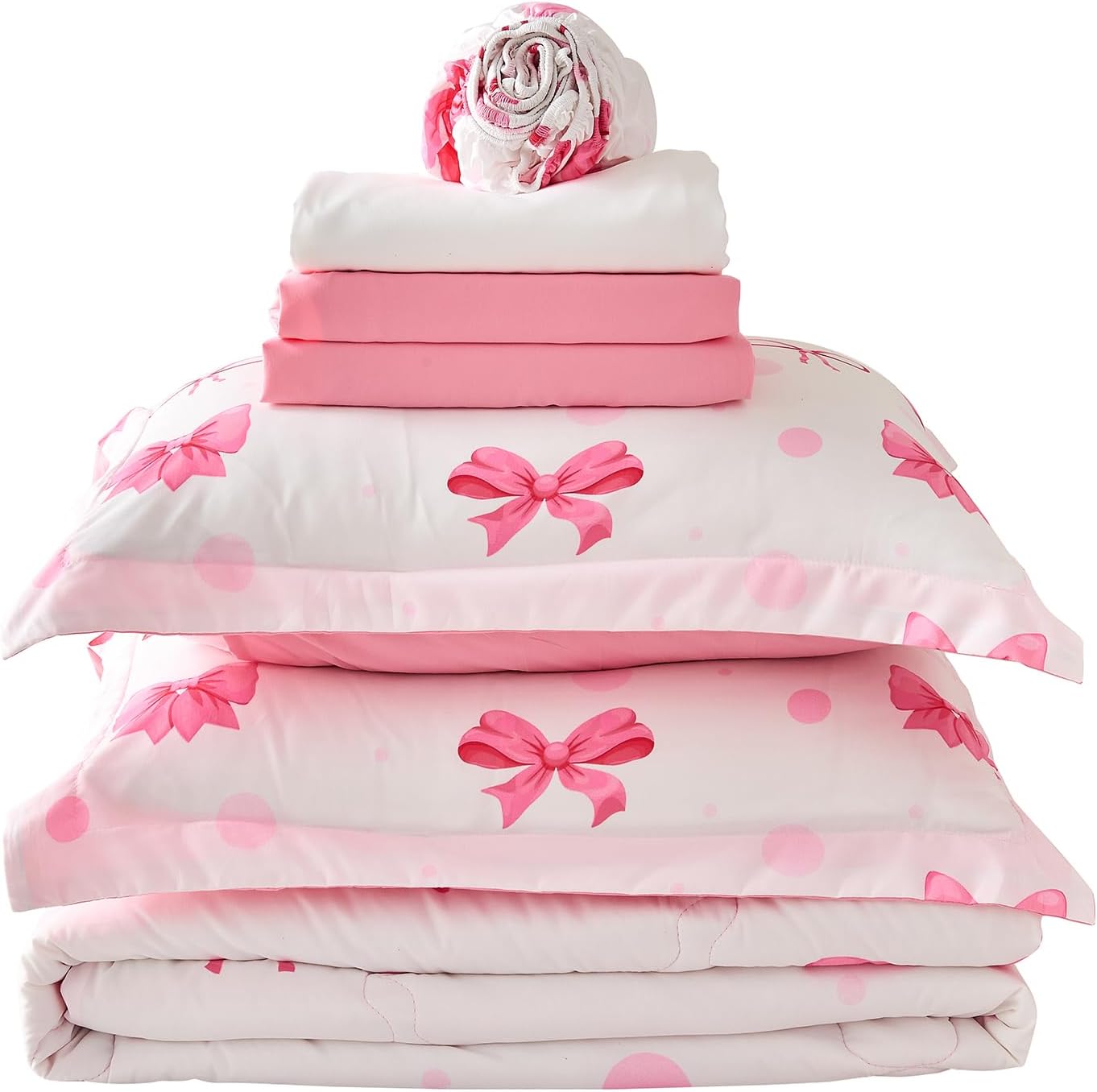 Bed in a Bag Kids Bedding Full Set: Our 7-piece pink bow full bedding sets for girls include a full-size comforter 80×90″, a fitted sheet 54”x75″, 1 flat sheet: 80”x96″, 2 pillow shams 20”x26″ and 2 pillowcases 20”x26″.