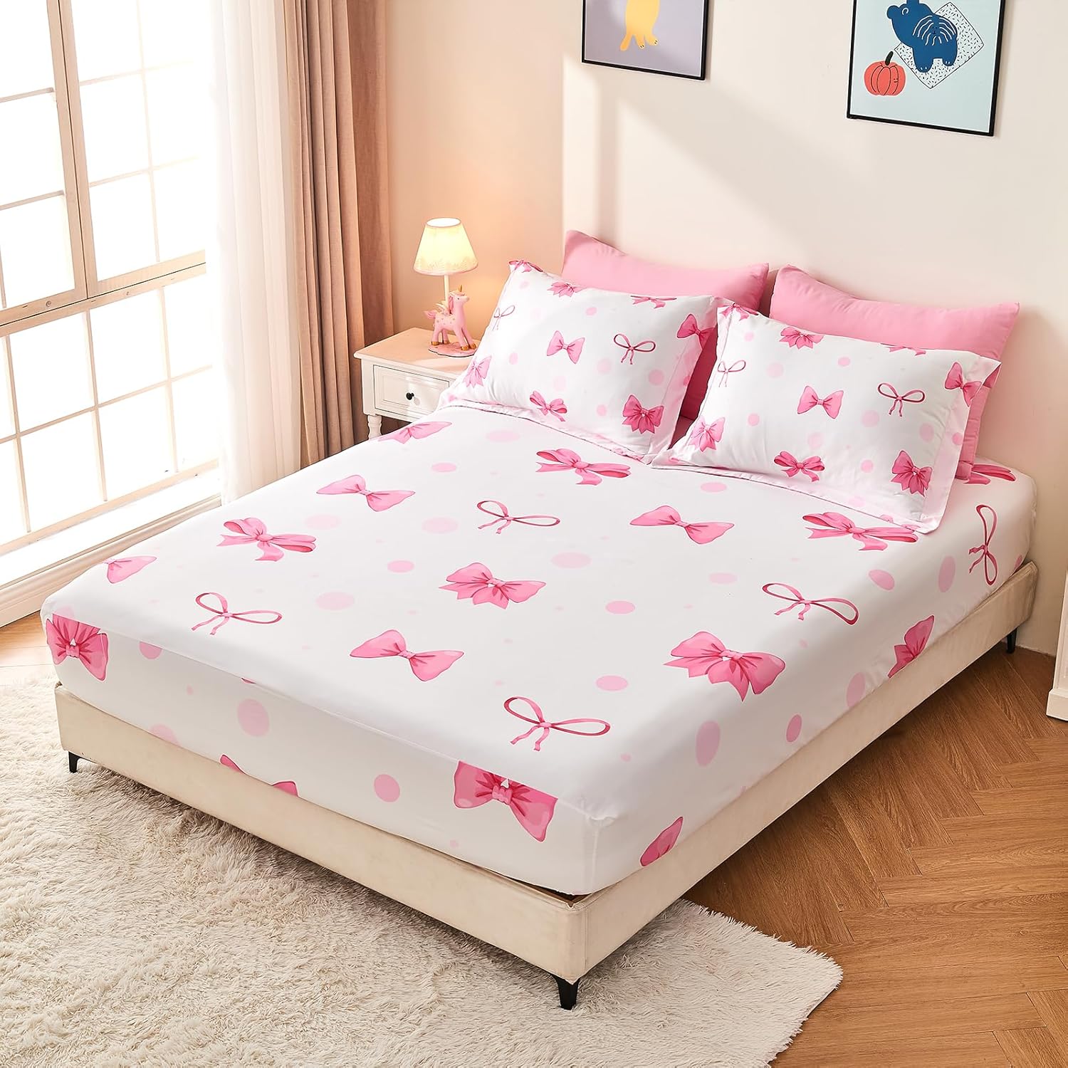 Unique Design: Brighten your room with the enchanting design of the pink bow comforter set. This comforter features some pink bows printed on white, for a vibrant and cute look. The matching sheet set also showcase the cute pink bow knots print to coordinate with the pink bow comforter.
