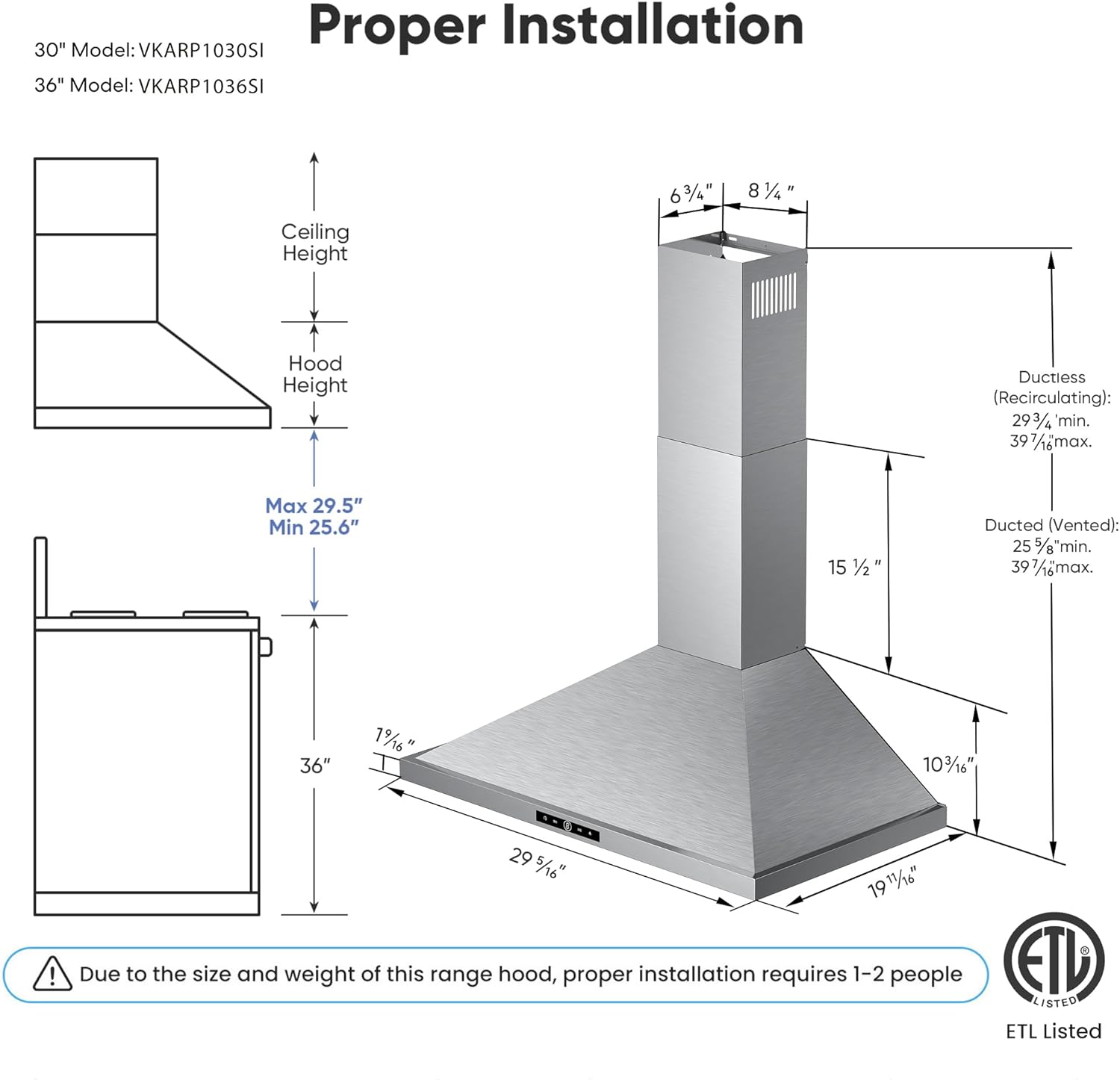 【Premium Stove Vent Hood】: Crafted from 430-grade brushed stainless steel, the sleek pyramidal design of the wall mount range hood 30-inch complements most kitchen decors. Optional carbon filter kits are available for ductless installations, offering flexibility for any kitchen setup.