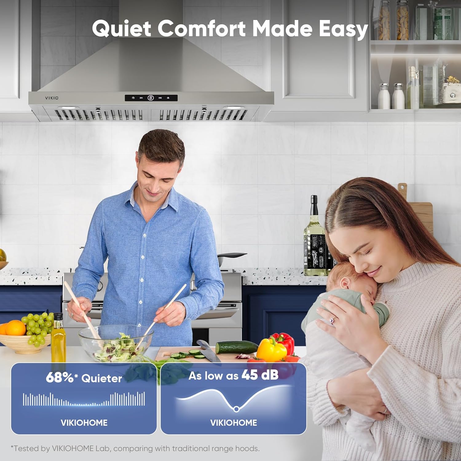 【Quiet and Powerful Ventilation】: The wall mount range hood 30-inch delivers a peaceful cooking environment with noise levels as low as 40 dBA at low speeds and under 65 dBA at high speeds. Its advanced ductwork system minimizes noise while maintaining effective ventilation, ideal for busy kitchens.