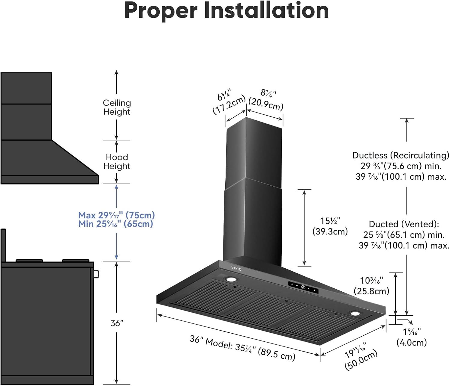 【Premium Stove Vent Hood】Crafted from 430-grade brushed stainless steel, the sleek pyramidal design of the wall mount range hood 36-inch complements most kitchen decors. Optional carbon filter kits are available for ductless installations, offering flexibility for any kitchen setup.