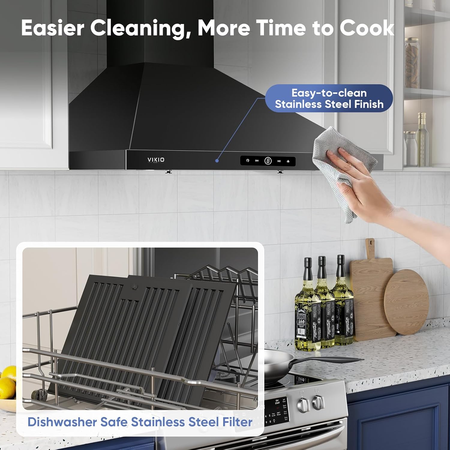 【Effective Filtration】Equipped with two dishwasher-safe, easy-to-remove stainless steel permanent filters, this wall mount range hood 36-inch effectively captures grease and oil, ensuring a cleaner kitchen and reducing buildup on appliances for easier maintenance.