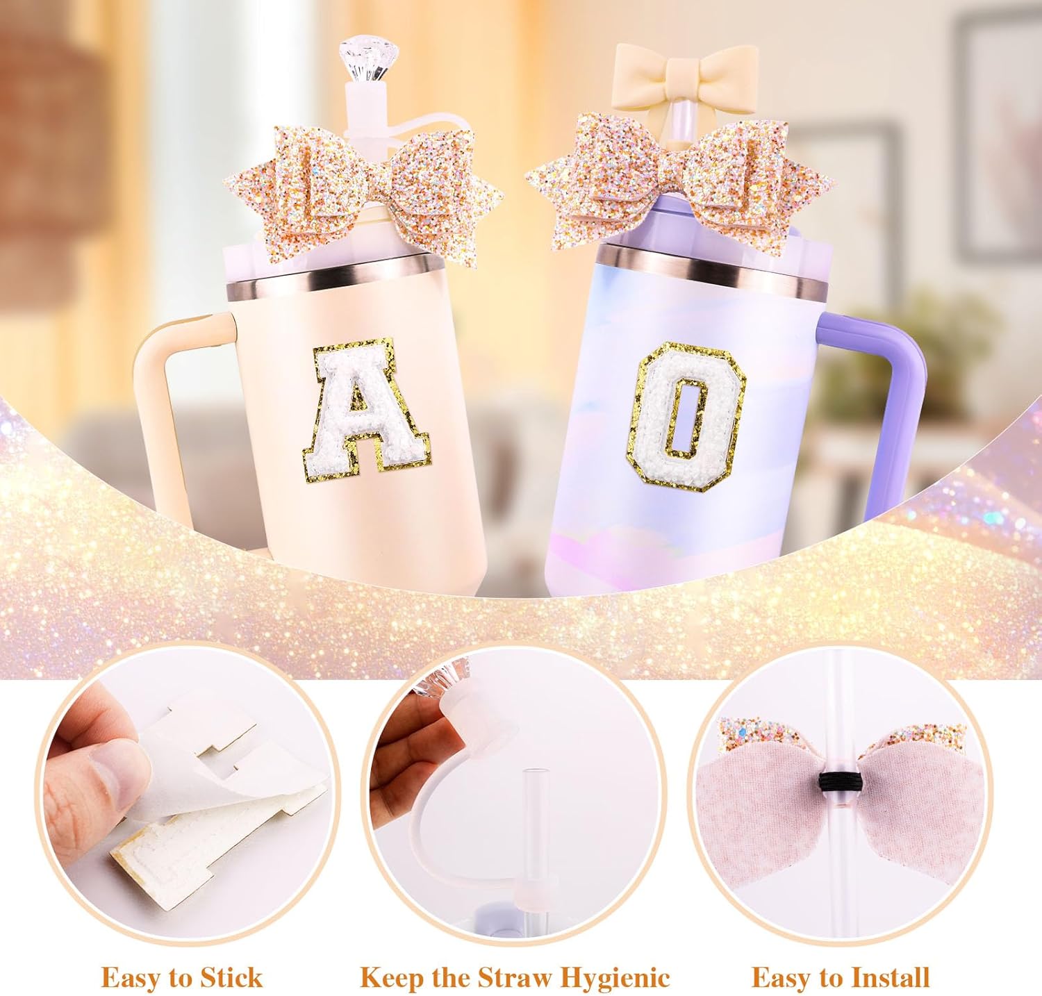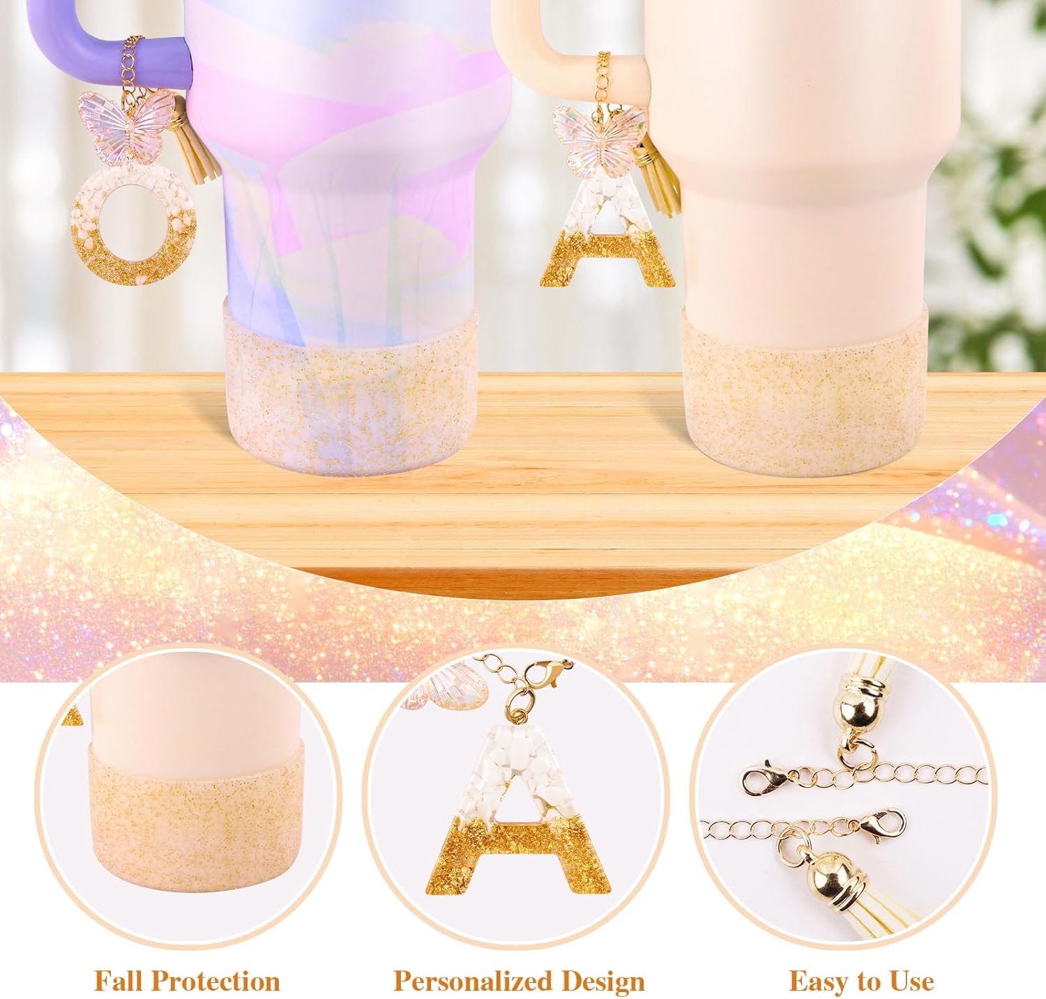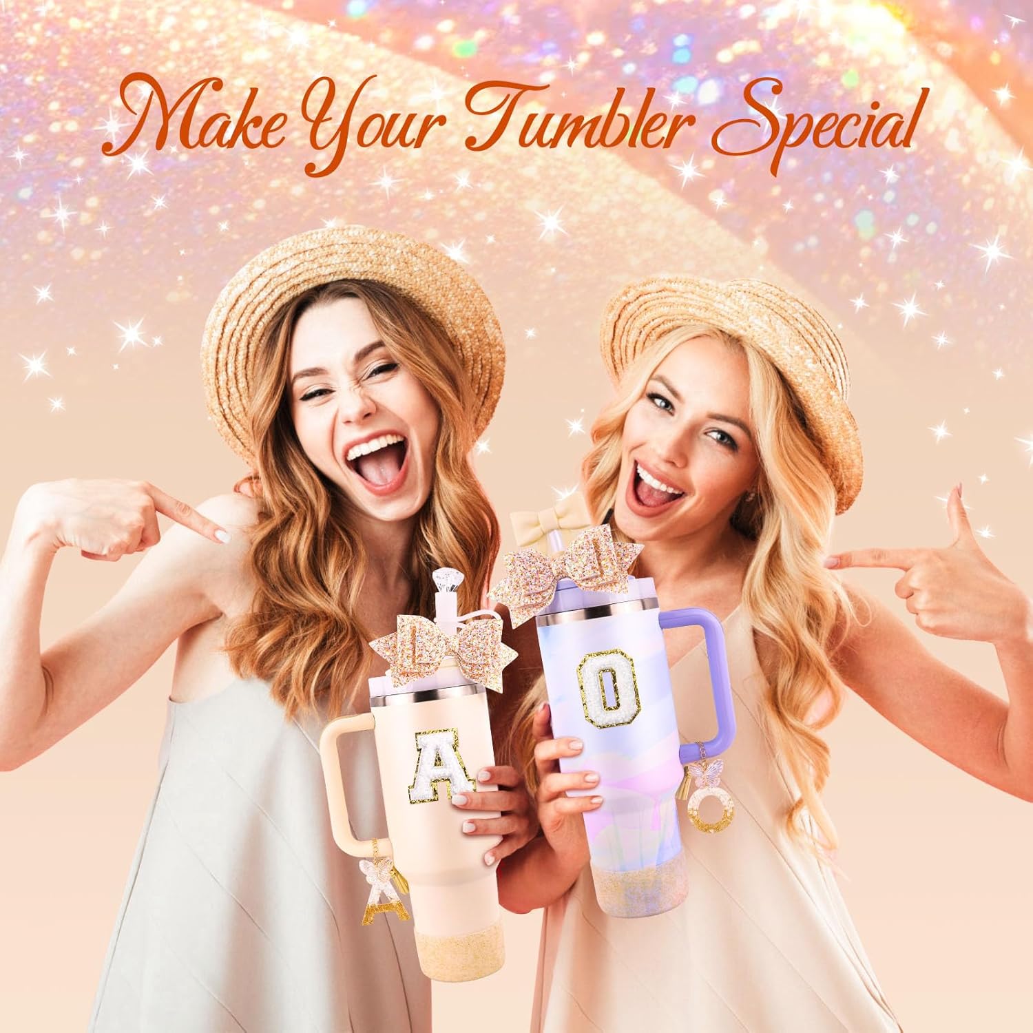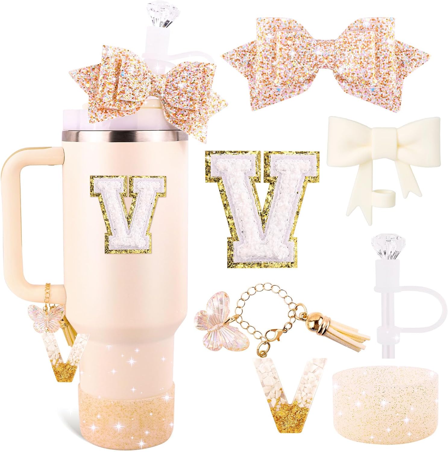 Perfect Tumbler Accessories Set: Our product includes 1pc white letter charm, 1pc glitter silicone boot, 1pc white diamond straw cover, 1pc bow-shaped straw topper, 1pc initial letter sticker and 1pc shining bow decoration for straw. This shining cream white water bottle accessories set will make you shine bright like a diamond!