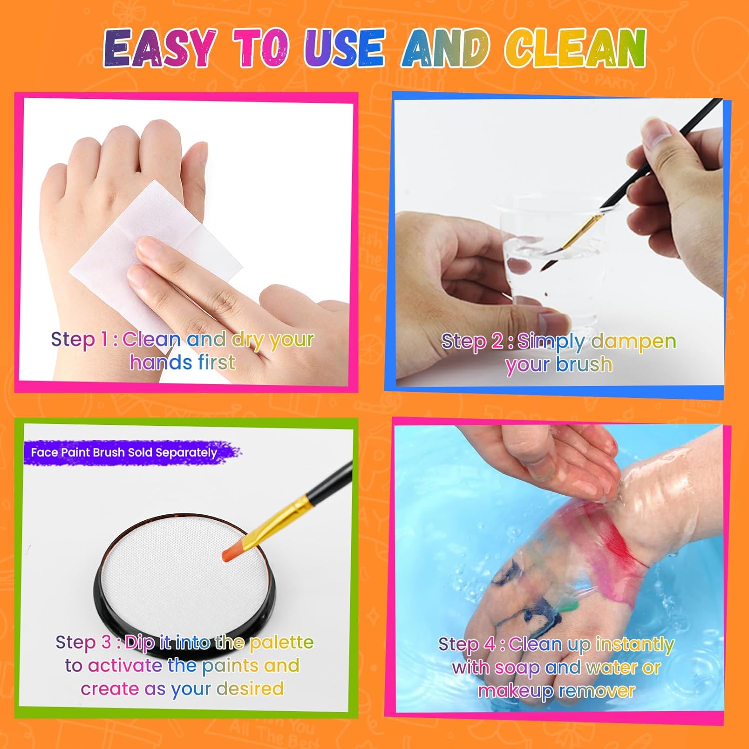 Effortless Application & Removal: Create flawless face art with our water activated face paint: clean and dry your hands first and then simply dampen your brush and dip it into the palette to activate the paints, then create as your desired. Cleans up instantly with soap and water or makeup remover—no harsh scrubbing or staining residue. Before first use, we strongly recommend conducting a small patch test to ensure compatibility with your skin