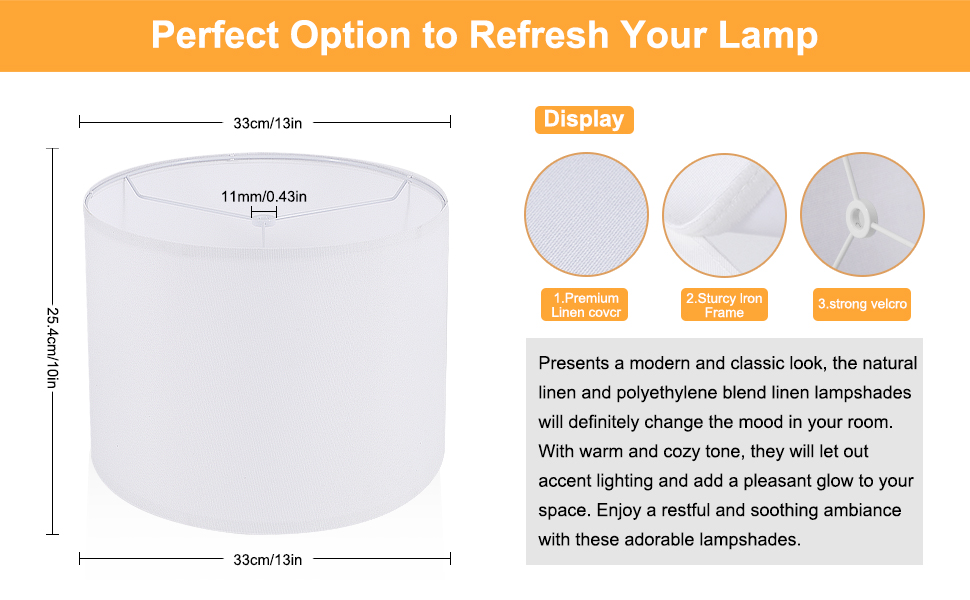 Unique size design: Top: 10 inches, bottom: 13 inches, height: 10 inches, screw thread: 0.43 inches (just for the lamp with harp holder), drum lamp shades can be perfectly matched with a variety of lamps, lampshades can be easily integrated, adding a unique charm to your home lighting