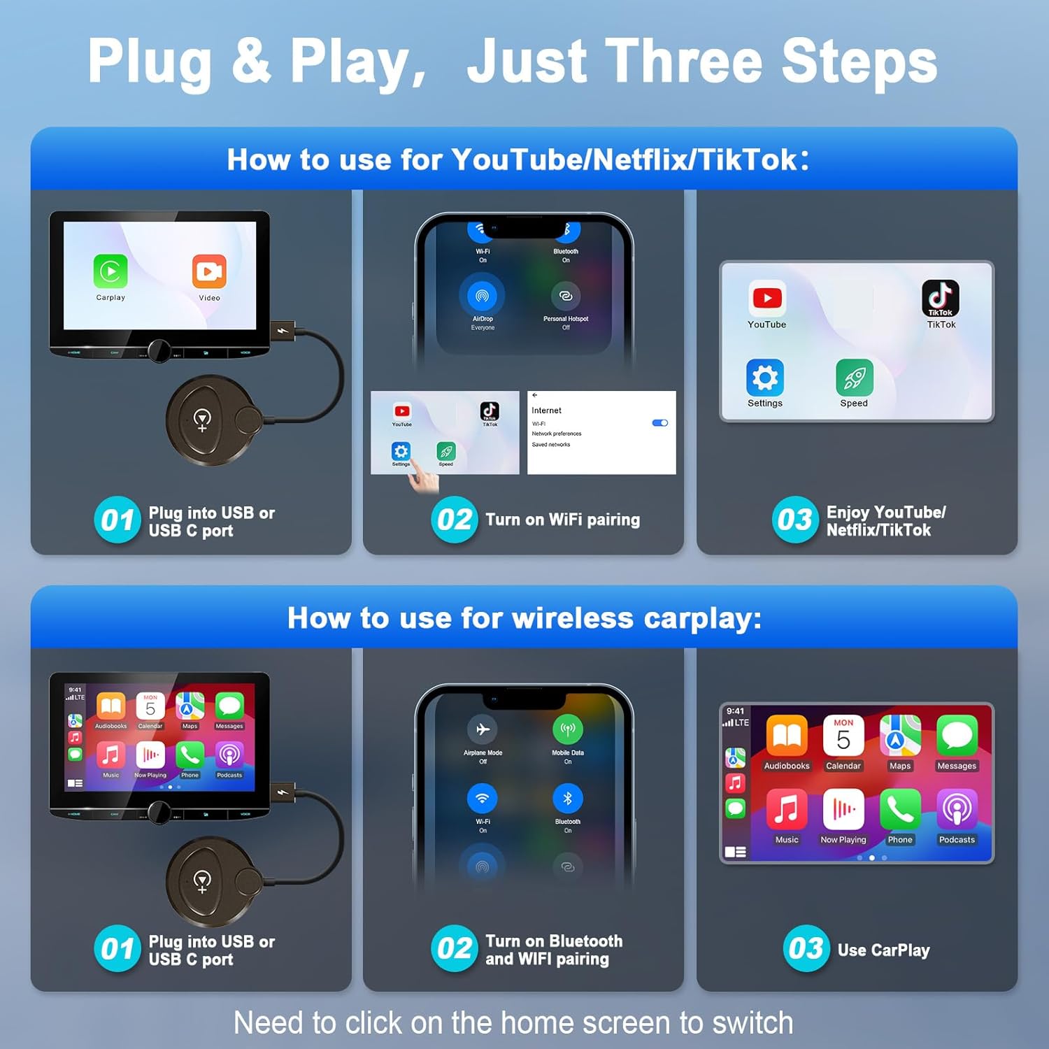 【Wireless CarPlay Adapter with Video】The wireless Apple carplay adapter can turn your car with wired carplay function into wireless carplay, while adding video viewing functions such as YouTube/Net-flix/Tiktok. The two can be switched at will, and you can project the video you want to the car anytime and anywhere to realize the romance of a car theater. You can also switch to the wireless carplay function anytime and anywhere without plugging in your iPhone. You can easily enjoy calls, messages, music, navigation, Siri, etc. while retaining the original car functions. (Note: To switch between carplay and video, you need to click on the home screen)