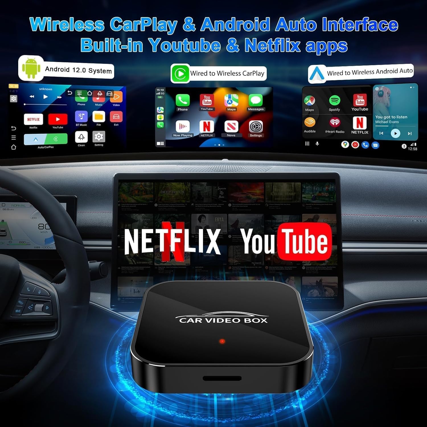 Wireless Carplay Adapter with Netflix YouTube, 2025 Car Play Video Box & Android Auto Dongle Plug & Play,Convert Wried to Wireless CarPlay for Cars from 2016 and iOS 10+ & TF Card (Black)