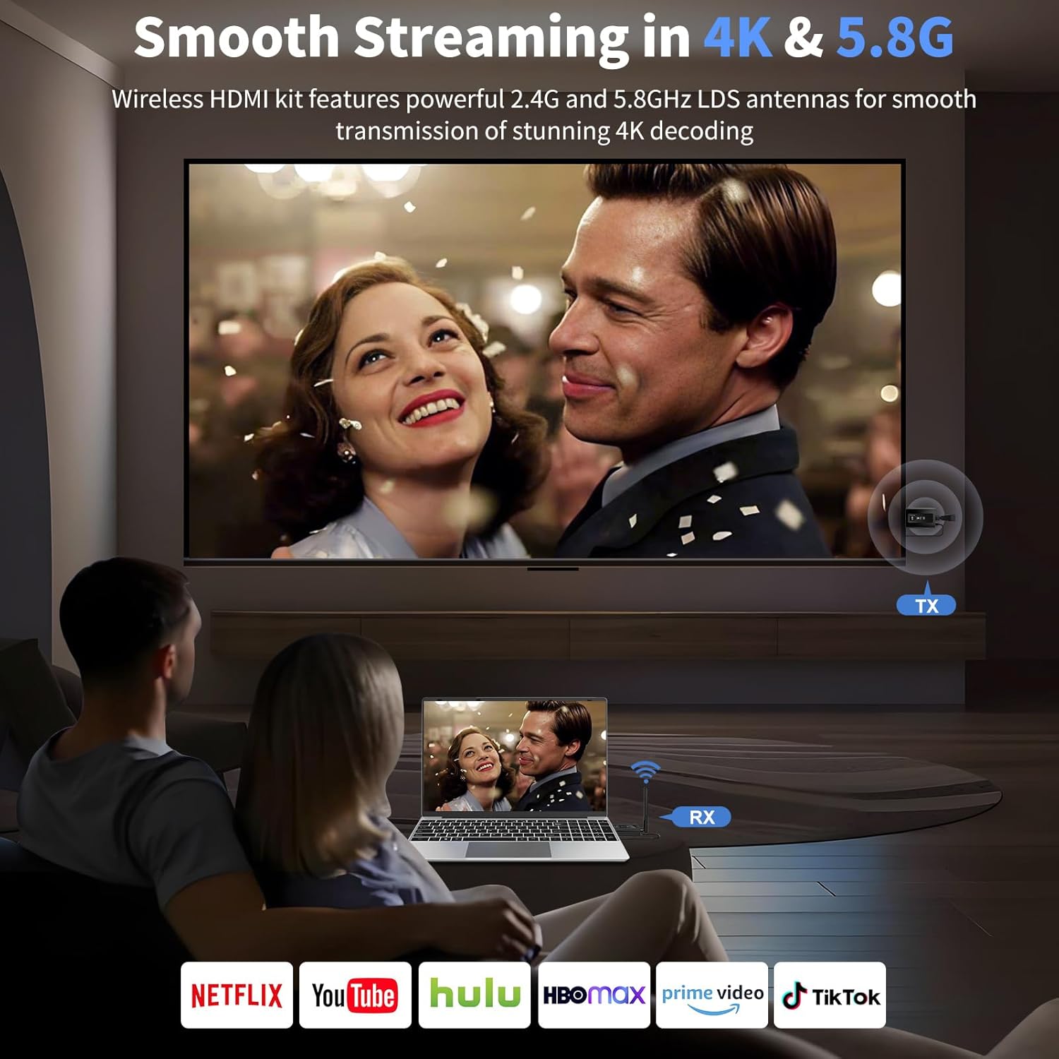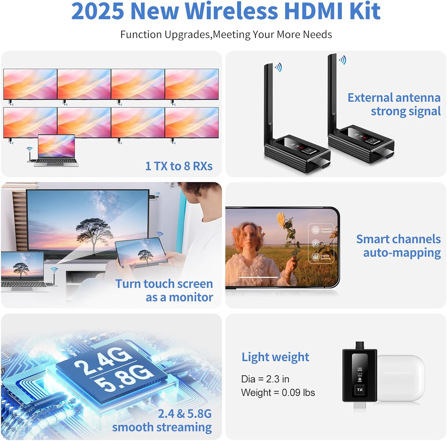 【Plug and Play】 The wireless HDMI transmitter and receiver provide true plug and play functionality without the need for messy cables Wi-Fi.Applications, Bluetooth, or complex settings. Bluetooth HDMI can easily connect devices within 10 seconds. 2025 upgraded technology ensures zero latency, making operations smoother, keeping workspaces clean, and providing seamless, high-quality streaming media.