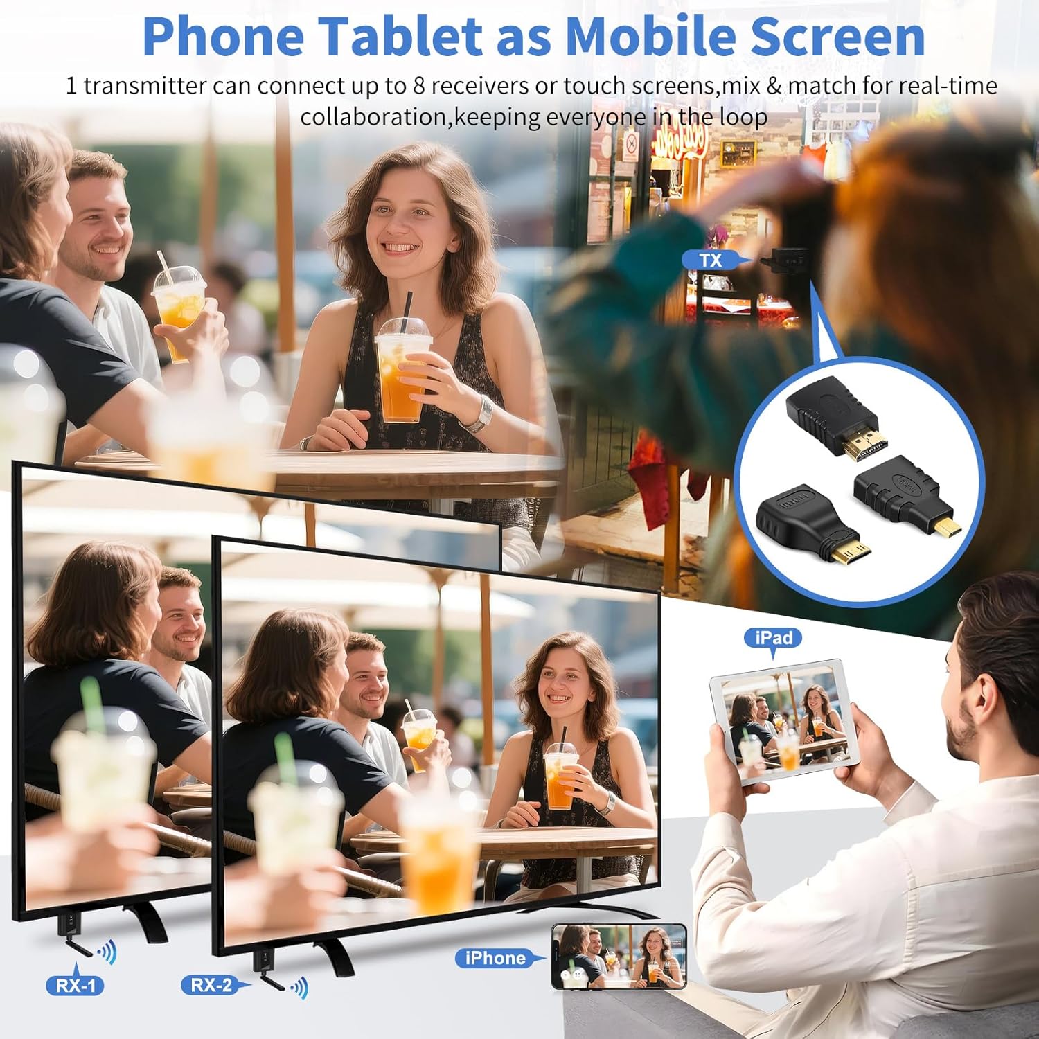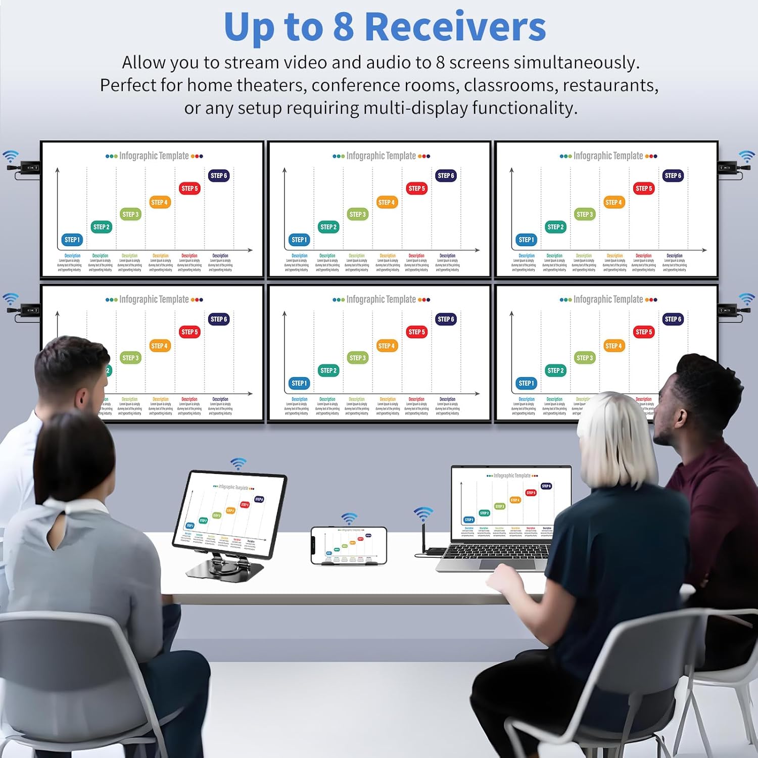 【Wirelessly Multi-Screen Expansion】Wirelessly stream to multiple TVs, revolutionizing your multi-screen interaction. A single HDMI transmitter effortlessly orchestrates four HDMI receivers, seamlessly syncing streaming video, audio, presentations, games, and more to multiple TV screens. wireless video to multiple tvs.up to 8RXs.