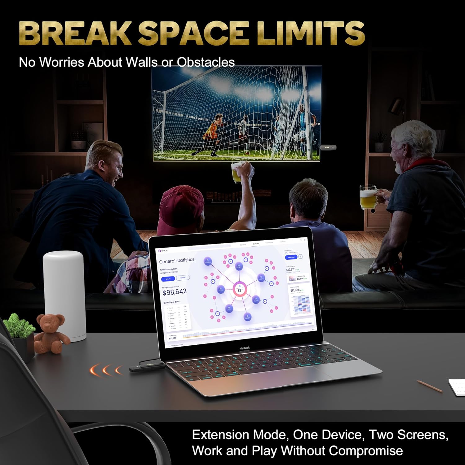 Dual Frequency for Seamless Performance: With dual-band support (5G + 2.4G), the bluetooth transmitter lets you stream movies, games, or work presentations without a hitch. Whether you’re lounging on the couch or racing to finish a work presentation, the wireless display adapter ensures your content flows smoothly to your wireless monitor, with no annoying buffering or pixelated screens.