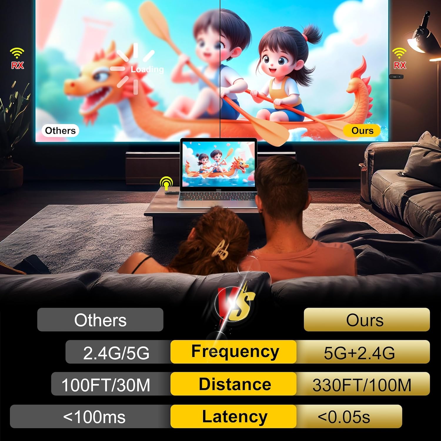 Long Transmission Range: Supports up to 330FT/100 meters in open laboratory conditions. In real home environments, the range is still more than sufficient for everyday use such as wireless TV setups, home theaters, presentations, or business meetings. Please note that actual distance may be affected by obstacles, walls, or local signal interference.