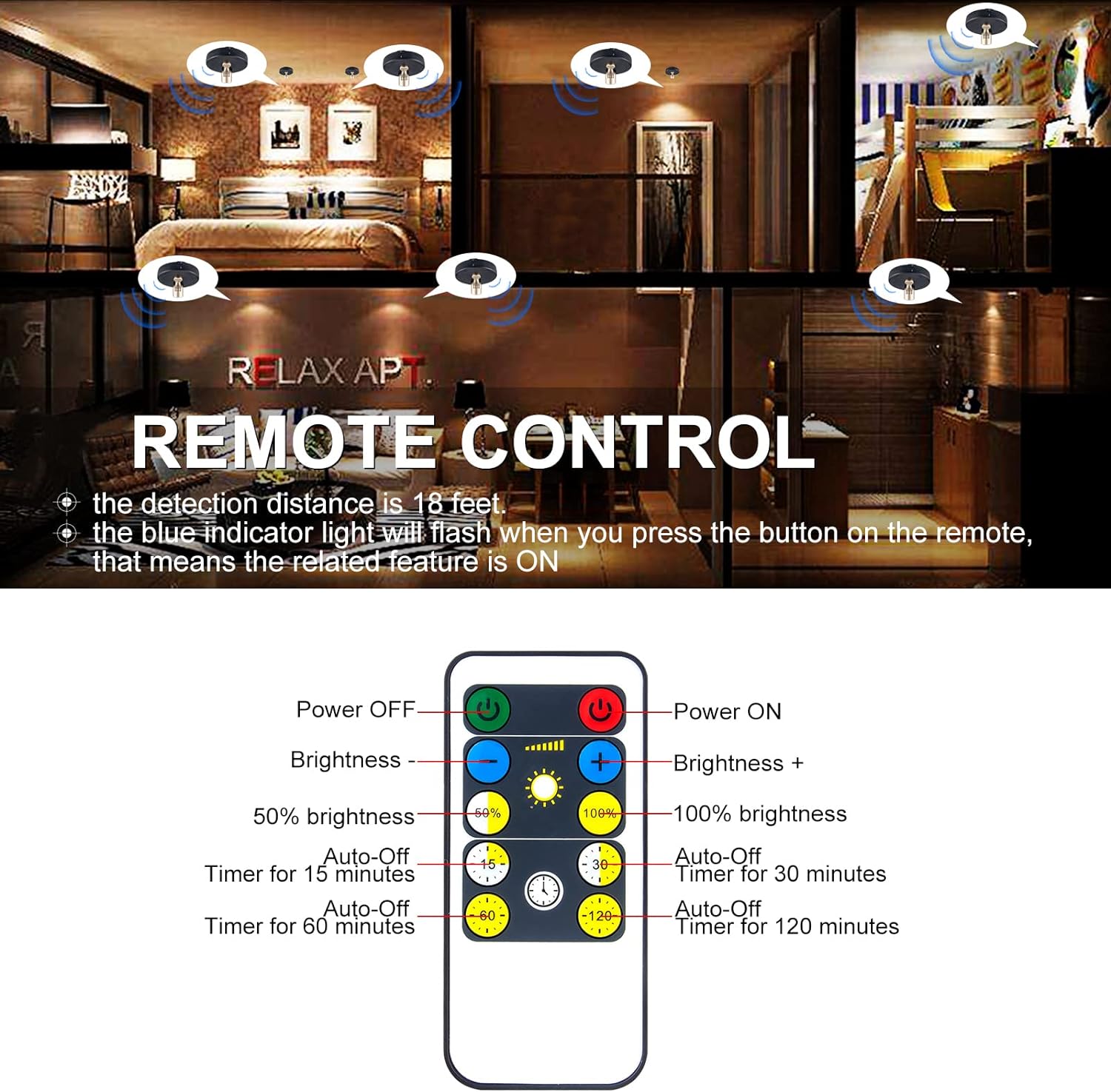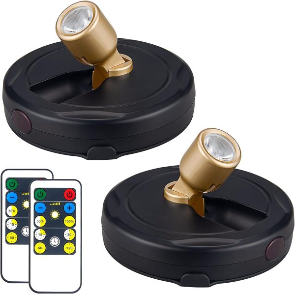 Remote Control Battery Spotlights: You can press the light switch button to turn the light ON/OFF or use the remote, operate portable spotlight within 18 ft. Nice low light as wall closet light or to spot light art or other item