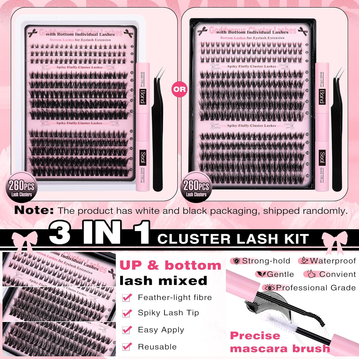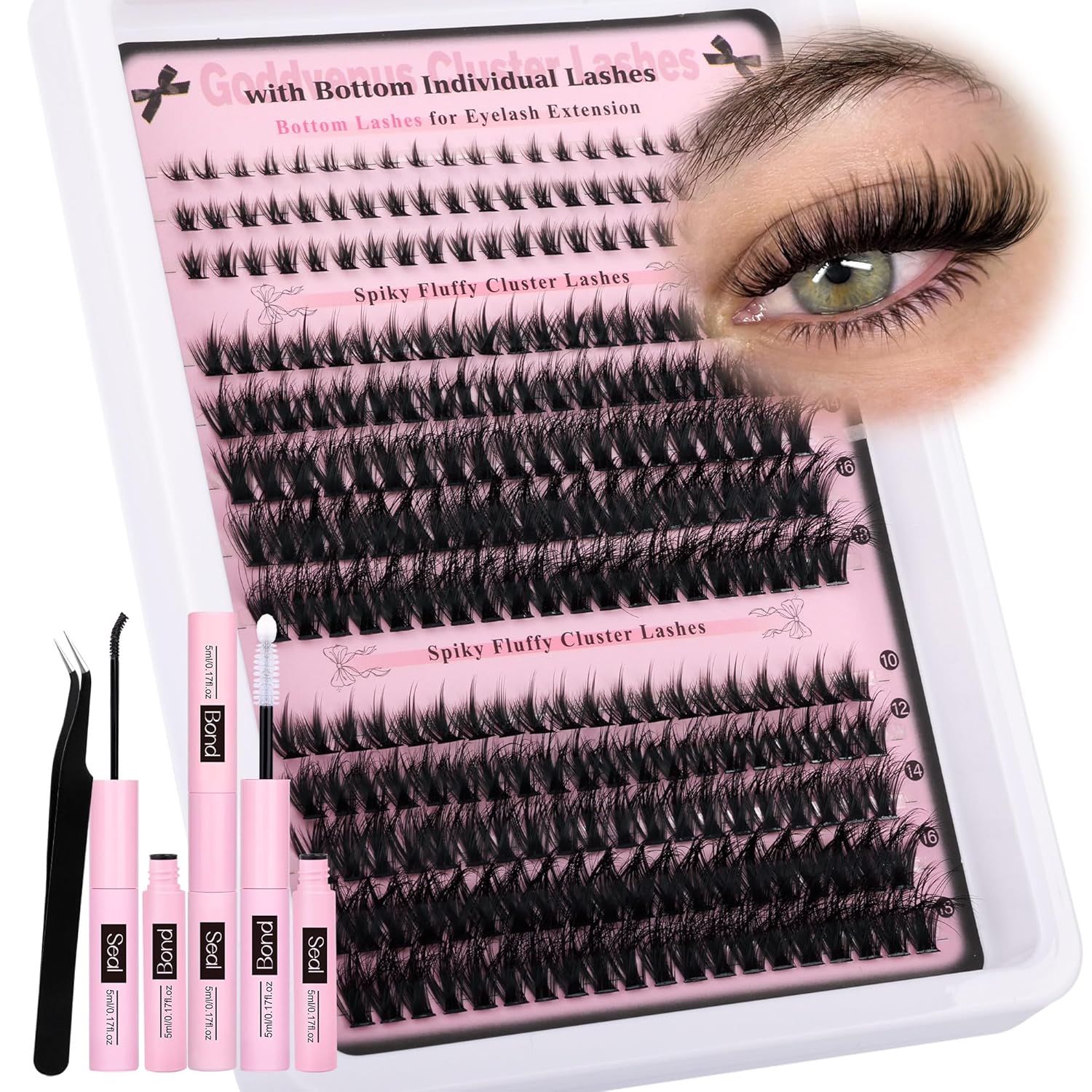 Wispy Lash Clusters Kit Cluster Eyelash Extensions Natural Lash Extension Kit C Curl Fluffy Individual Eyelashes with Bottom Lashes Clusters Waterproof Bond and Seal DIY at Home