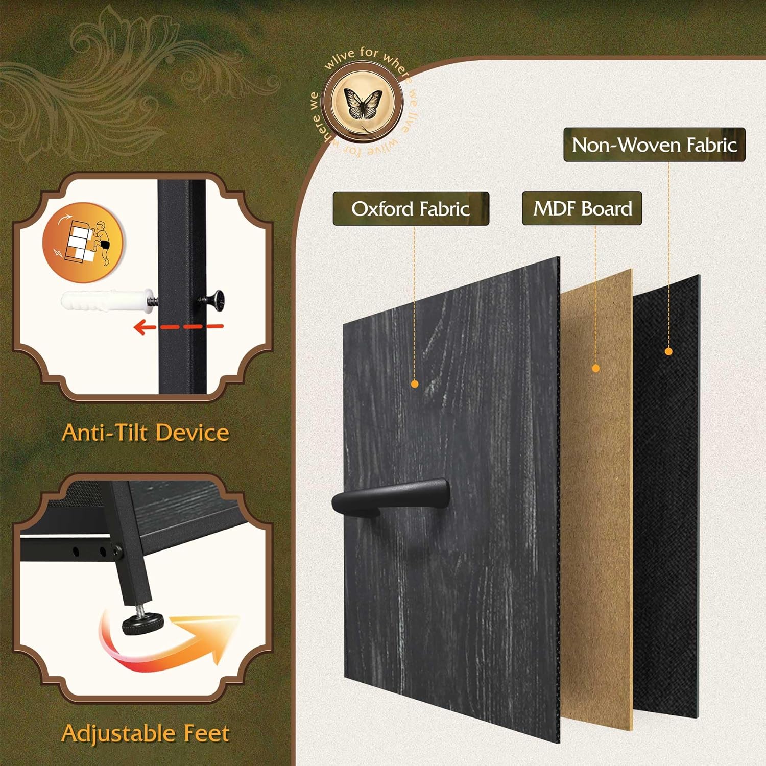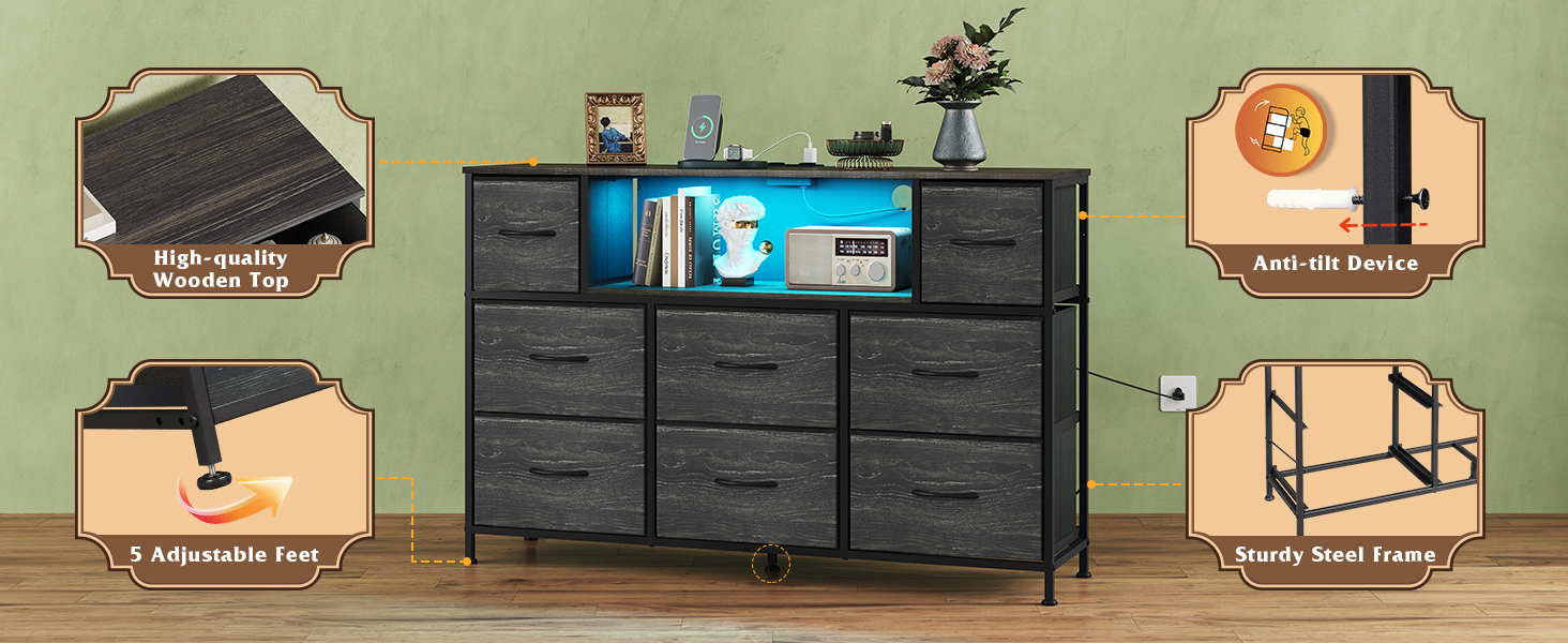 WLIVE Black TV Stand for 45, 50, 55 inch TV, Entertainment Center with LED Lights & Charging Station, TV Media Console Table with 8 Fabric Drawers and Open Shelves for Living Room, Hallway, Wood Top