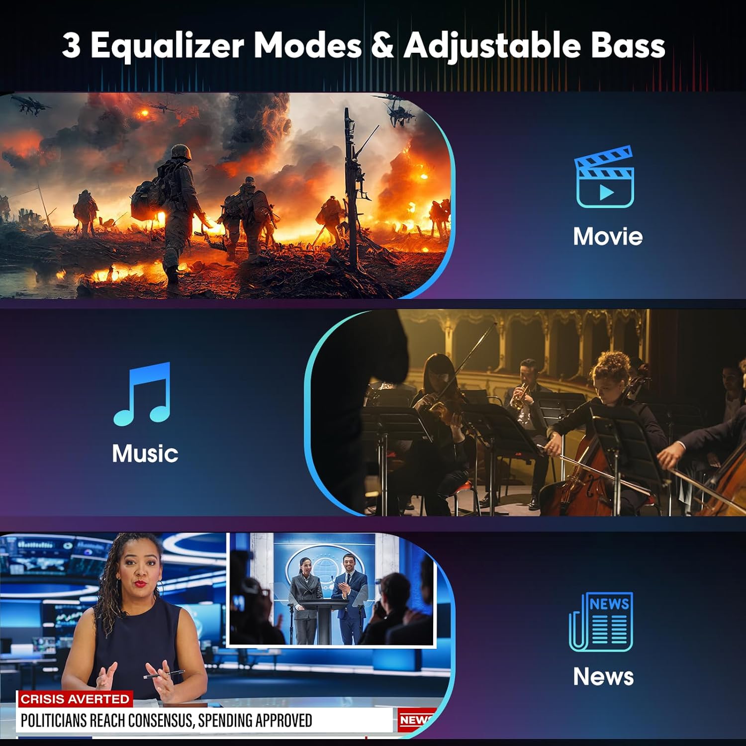 DSP with 3 EQ Modes: TV sound bar built-in DSP ensures stable audio performance. Choose from Music Mode for balanced sound, Movie Mode for cinematic surround effects, and News Mode for clearer vocals—so you never miss a detail