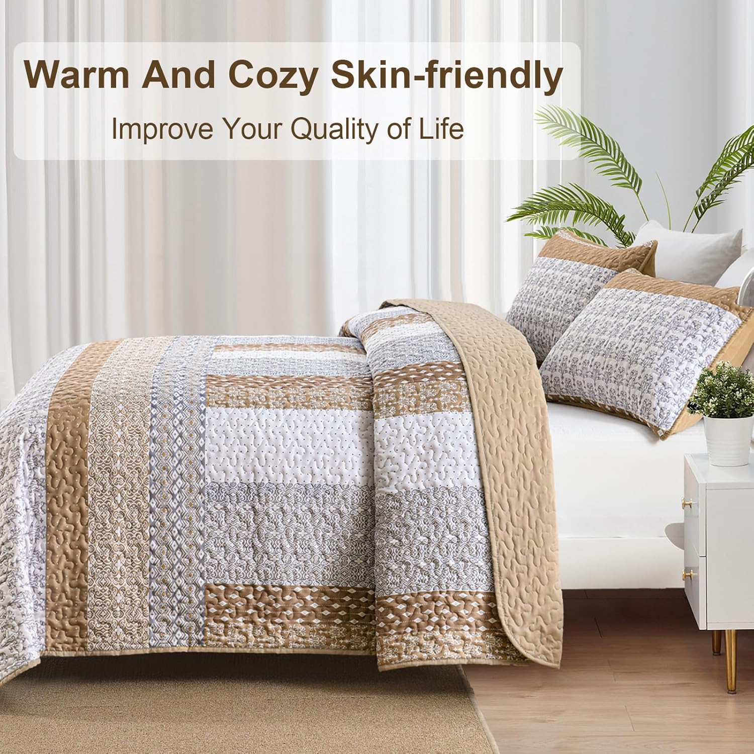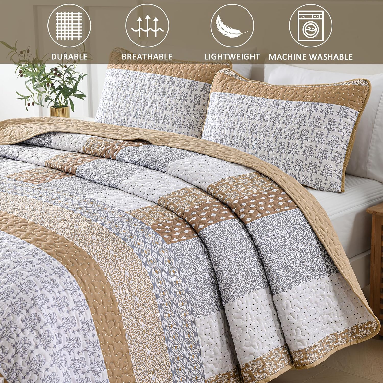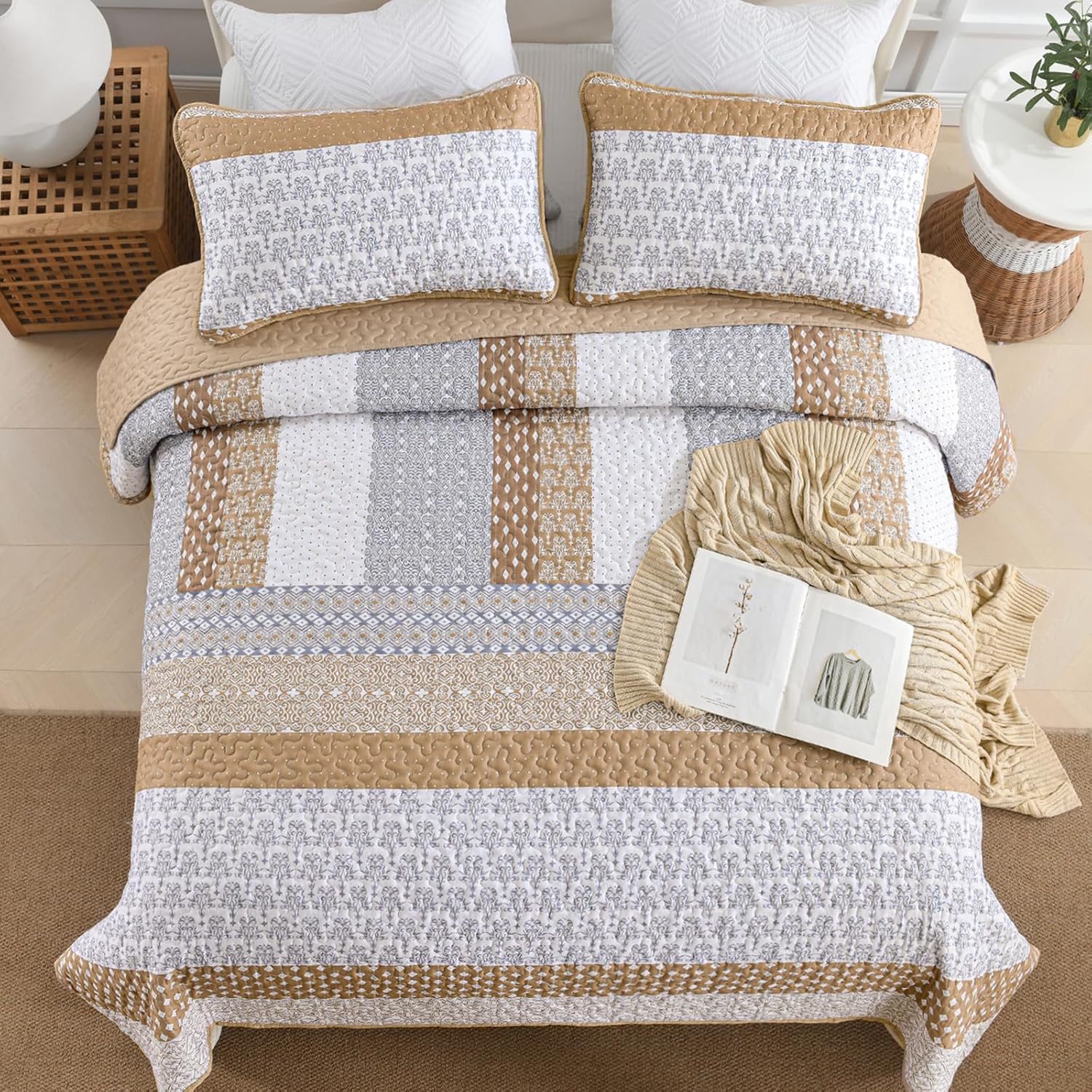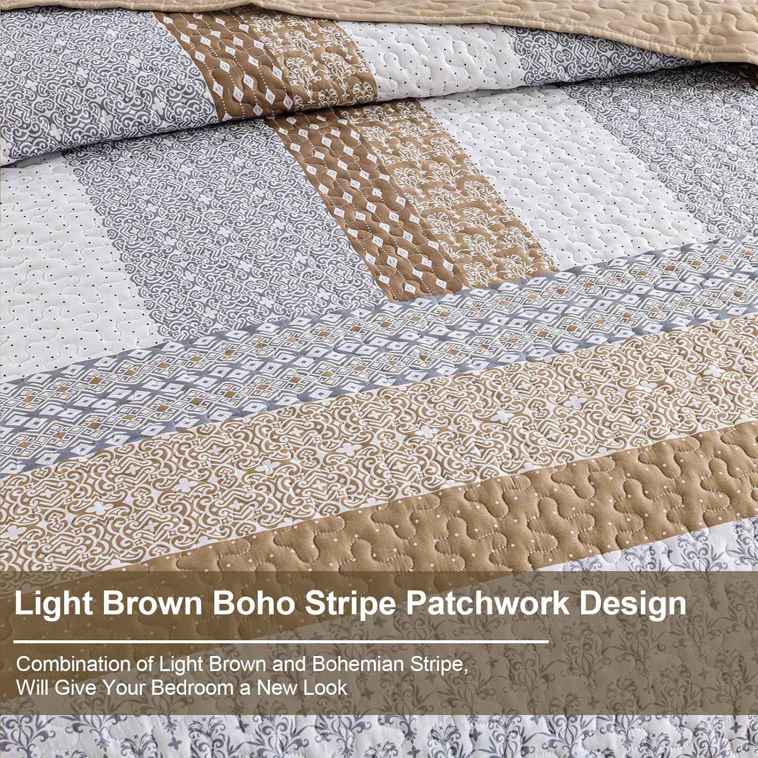 WONGS BEDDING Brown Quilt Queen Size, Bohemian Stripe Quilt Sets 3 Pieces Boho Quilted Bedspread Set Lightweight Microfiber Coverlet Bedding Set All Season (96″x90″)