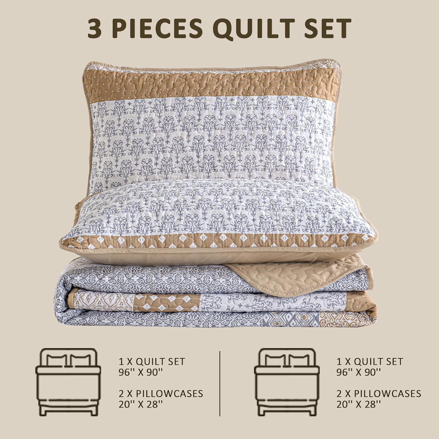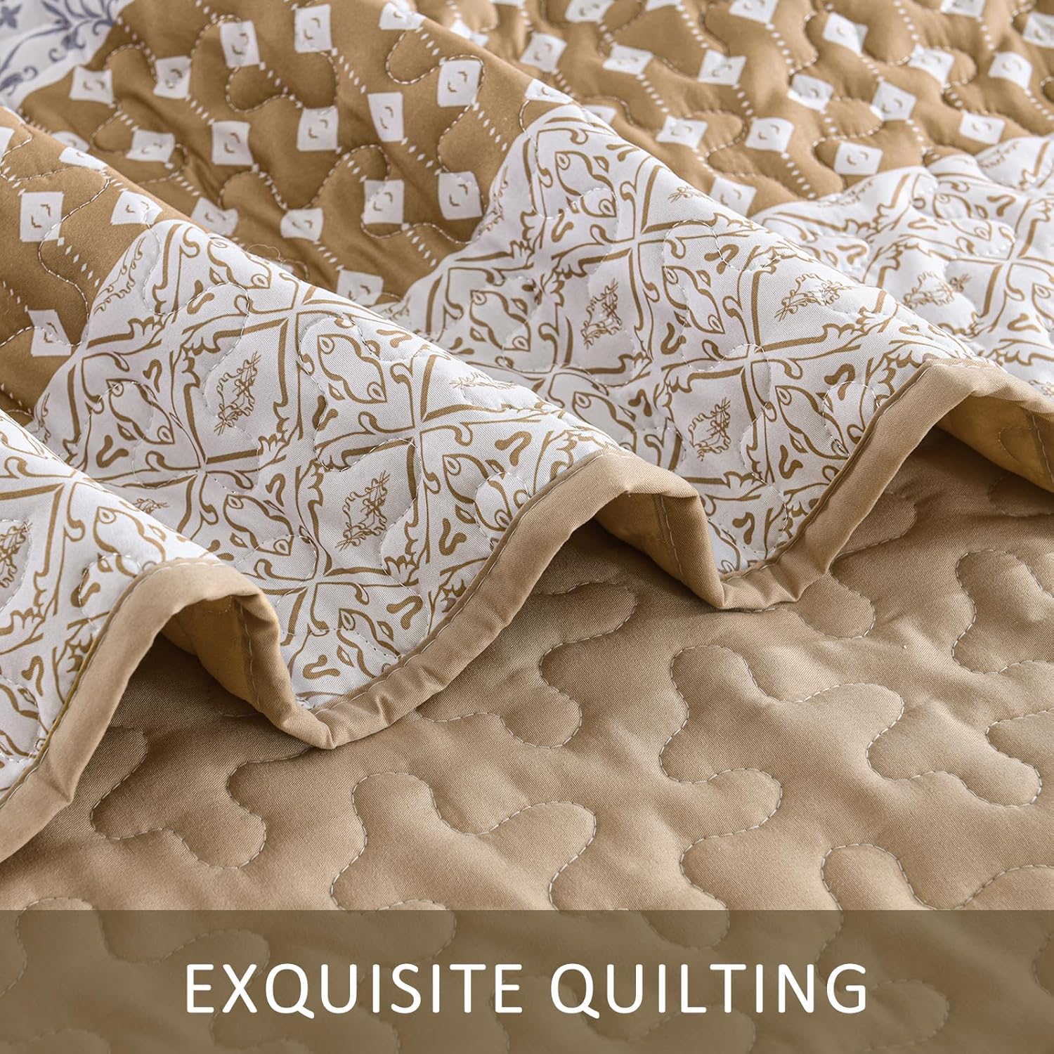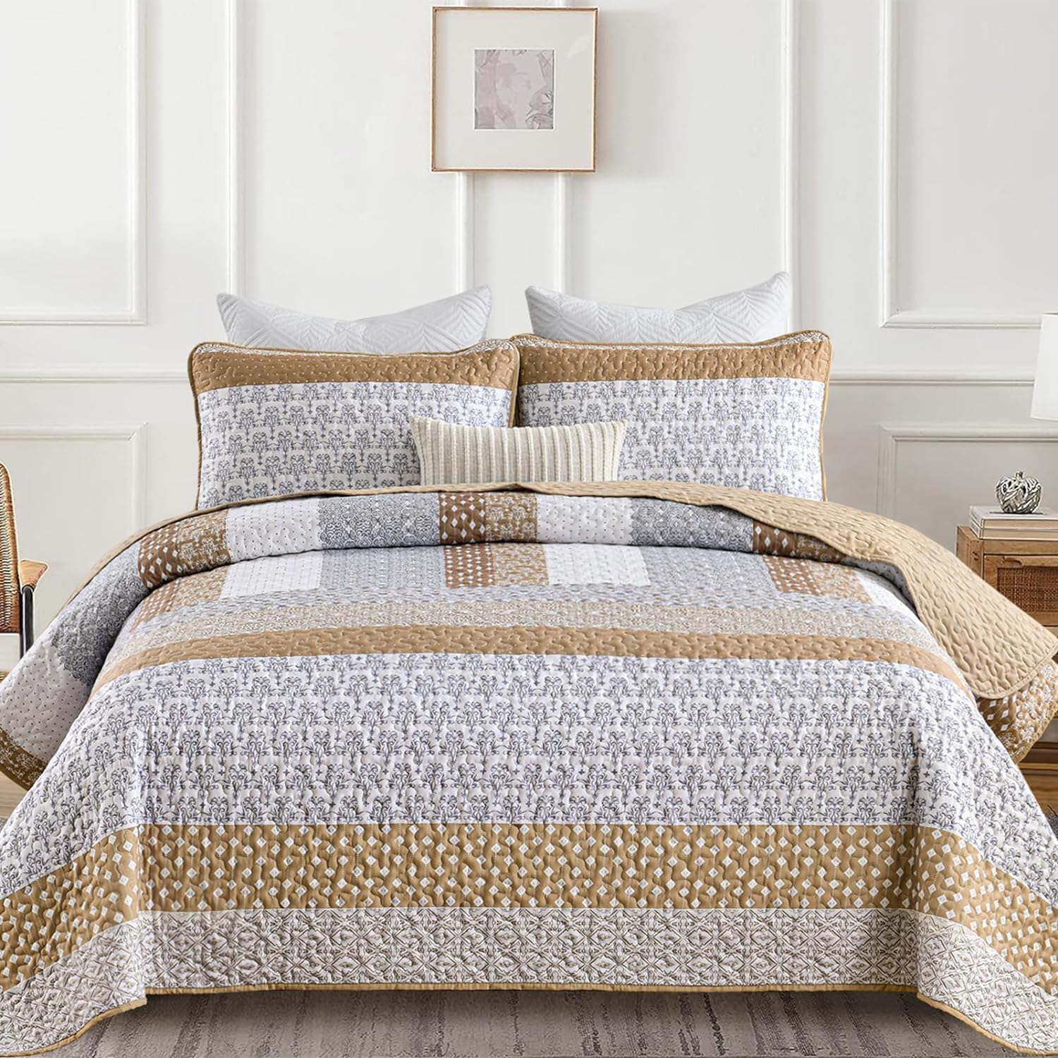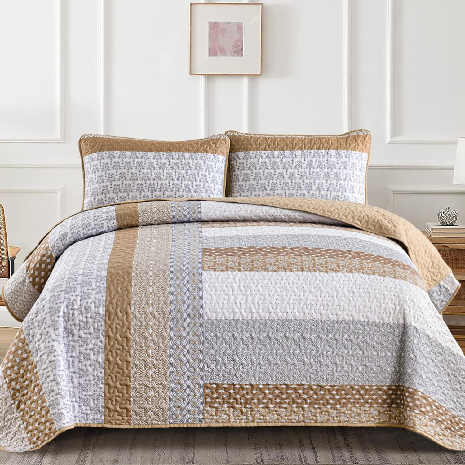 WONGS BEDDING Brown Quilt Queen Size, Bohemian Stripe Quilt Sets 3 Pieces Boho Quilted Bedspread Set Lightweight Microfiber Coverlet Bedding Set All Season (96″x90″)